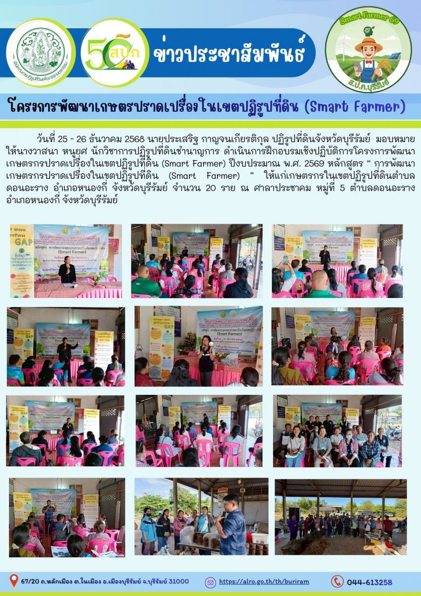 ส.ป.ก.บุรีรัมย์ ดำเนินการฝึกอบรมเชิงปฏิบัติการโครงการพัฒนาเกษตรกรปราดเปรื่องในเขตปฏิรูปที่ดิน (Smart Farmer) ปีงบประมาณ พ.ศ. 2569 ระหว่างวันที่ 25 - 27 ธันวาคม 2568