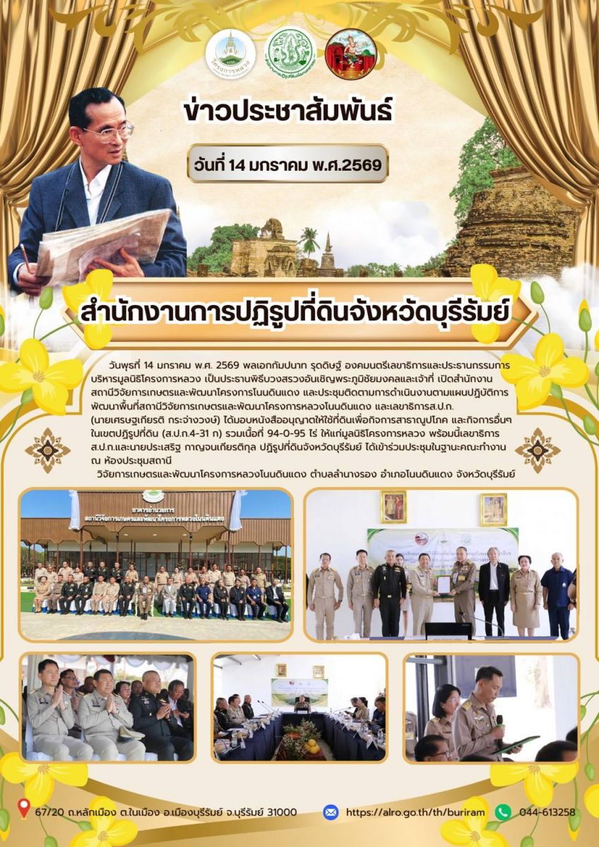 วันที่ 14 มกราคม 2569 ส.ป.ก. เข้าร่วมพิธีเปิดสำนักงานฯ พร้อมมอบเอกสารสิทธิ์ การใช้ประโยชน์ที่ดิน (ส.ป.ก.) และประชุมการติดตามการดำเนินงานตามแผนปฏิบัติการพัฒนาพื้นที่สถานีวิจัยการเกษตรและพัฒนาโครงการหลวงโนนดินแดง ณ จังหวัดบุรีรัมย์