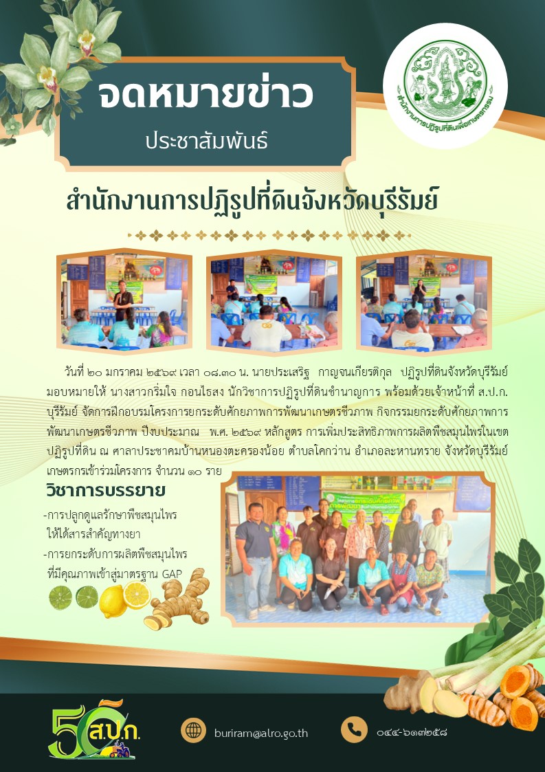 วันอังคารที่ 20 มกราคม 2569 นายประเสริฐ กาญจนเกียรติกุล ปฏิรูปที่ดินจังหวัดบุรีรัมย์ มอบหมายให้ นางสาวกริ่มใจ กอนไธสง นักวิชาการปฏิรูปที่ดิน ชำนาญการ ดำเนินการฝึกอบรมเกษตรกรตามโครงการยกระดับศักยภาพการพัฒนาสินค้าเกษตรชีวภาพในเขตปฏิรูปที่ดินจังหวัดบุรีรัมย์ หลักสูตร การเพิ่มประสิทธิภาพการผลิตพืชสมุนไพรในเขตปฏิรูปที่ดิน