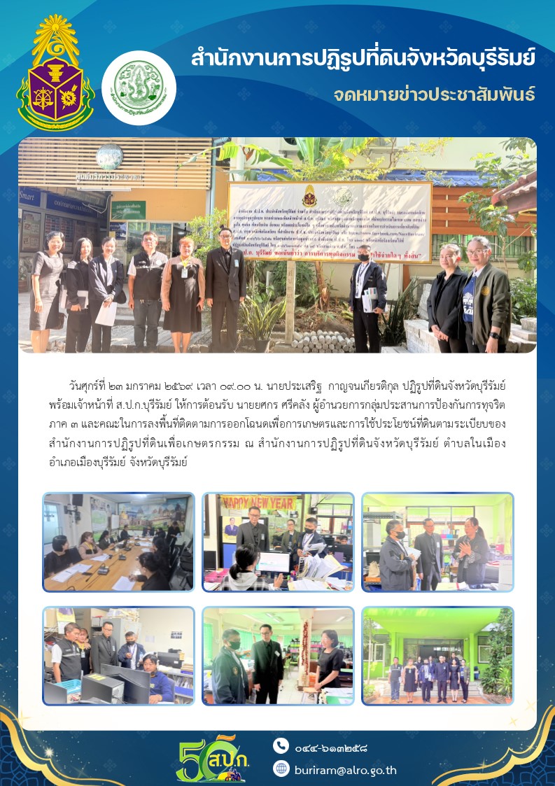 วันศุกร์ที่ 23 มกราคม 2569 เวลา 09.00 น. นายประเสริฐ กาญจนเกียรติกุล ปฏิรูปที่ดินจังหวัดบุรีรัมย์ พร้อมเจ้าหน้าที่ ส.ป.ก.บุรีรัมย์ ให้การต้อนรับ นายยศกร ศรีคลัง ผู้อำนวยการกลุ่มประสานการป้องกันการทุจริต ภาค 3 และคณะในการลงพื้นที่ติดตามการออกโฉนดเพื่อการเกษตรและการใช้ประโยชน์ที่ดินตามระเบียบของสำนักงานการปฏิรูปที่ดินเพื่อเกษตรกรรม ณ สำนักงานการปฏิรูปที่ดินจังหวัดบุรีรัมย์
