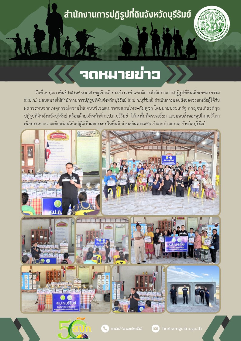 วันที่ 3 กุมภาพันธ์ 2569 นายเศรษฐเกียรติ กระจ่างวงษ์ เลขาธิการสำนักงานการปฏิรูปที่ดินเพื่อเกษตรกรรม (ส.ป.ก.) มอบหมายให้สำนักงานการปฏิรูปที่ดินจังหวัดบุรีรัมย์ (ส.ป.ก.บุรีรัมย์) ดำเนินการมอบสิ่งของช่วยเหลือผู้ได้รับผลกระทบจากเหตุการณ์ความไม่สงบบริเวณแนวชายแดนไทย–กัมพูชาโดยนายประเสริฐ กาญจนเกียรติกุล ปฏิรูปที่ดินจังหวัดบุรีรัมย์ พร้อมด้วยเจ้าหน้าที่ ส.ป.ก.บุรีรัมย์ ได้ลงพื้นที่ตรวจเยี่ยม และมอบสิ่งของอุปโภคบริโภคเพื่อบรรเทาความเดือดร้อนให้แก่ผู้ได้รับผลกระทบในพื้นที่ ตำบลจันทบเพชร อำเภอบ้านกรวด จังหวัดบุรีรัมย์