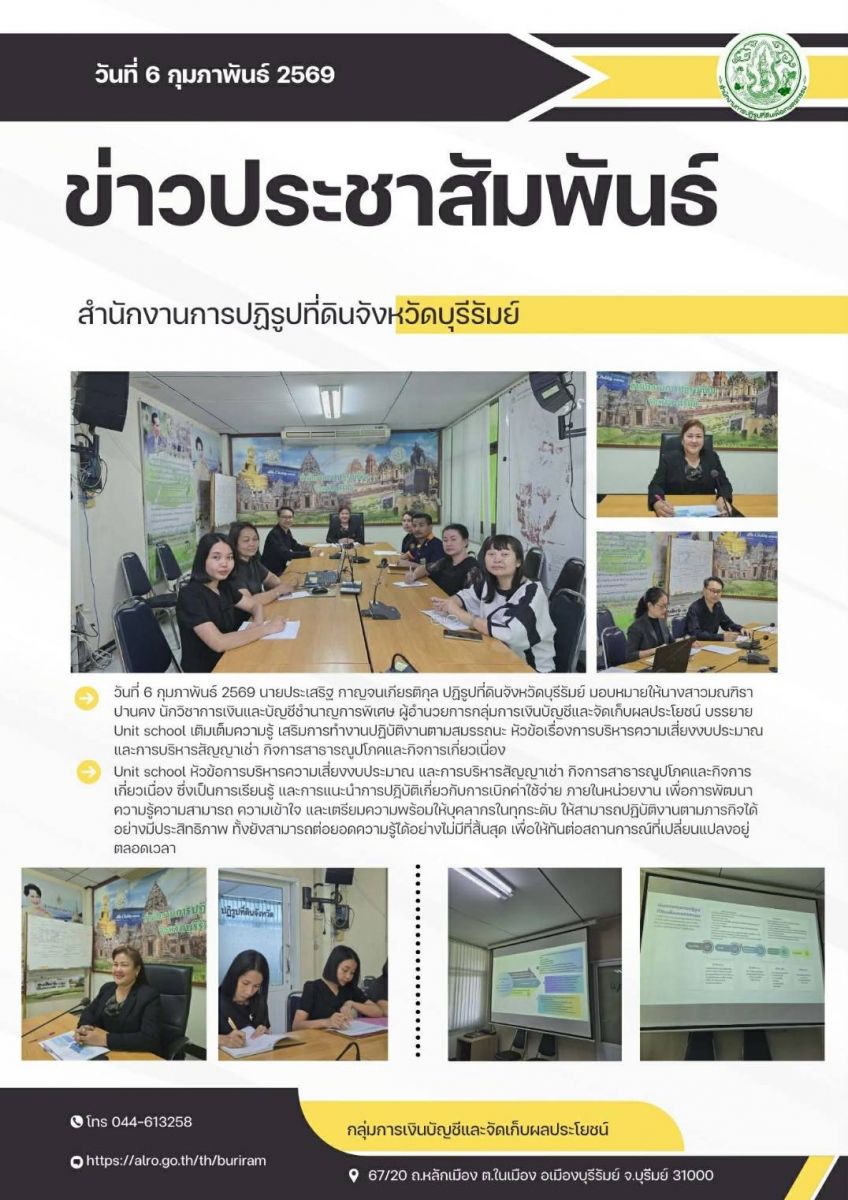 วันศุกร์ที่ 6 กุมภาพันธ์ 2569 นายประเสริฐ กาญจนเกียรติกุล ปฏิรูปที่ดินจังหวัดบุรีรัมย์ มอบหมายให้นางสาวมณฑิรา ปานคง ผอ.กลุ่มการเงินบัญชีและจัดเก็บผลประโยชน์ บรรยาย Unit School เติมเต็มความรู้ เสริมการทำงานตามสมรรถนะ หัวข้อ การบริหารความเสี่ยงงบประมาณและการบริหารสัญญาเช่า กิจการสาธารณูปโภคและกิจการเกี่ยวเนื่อง