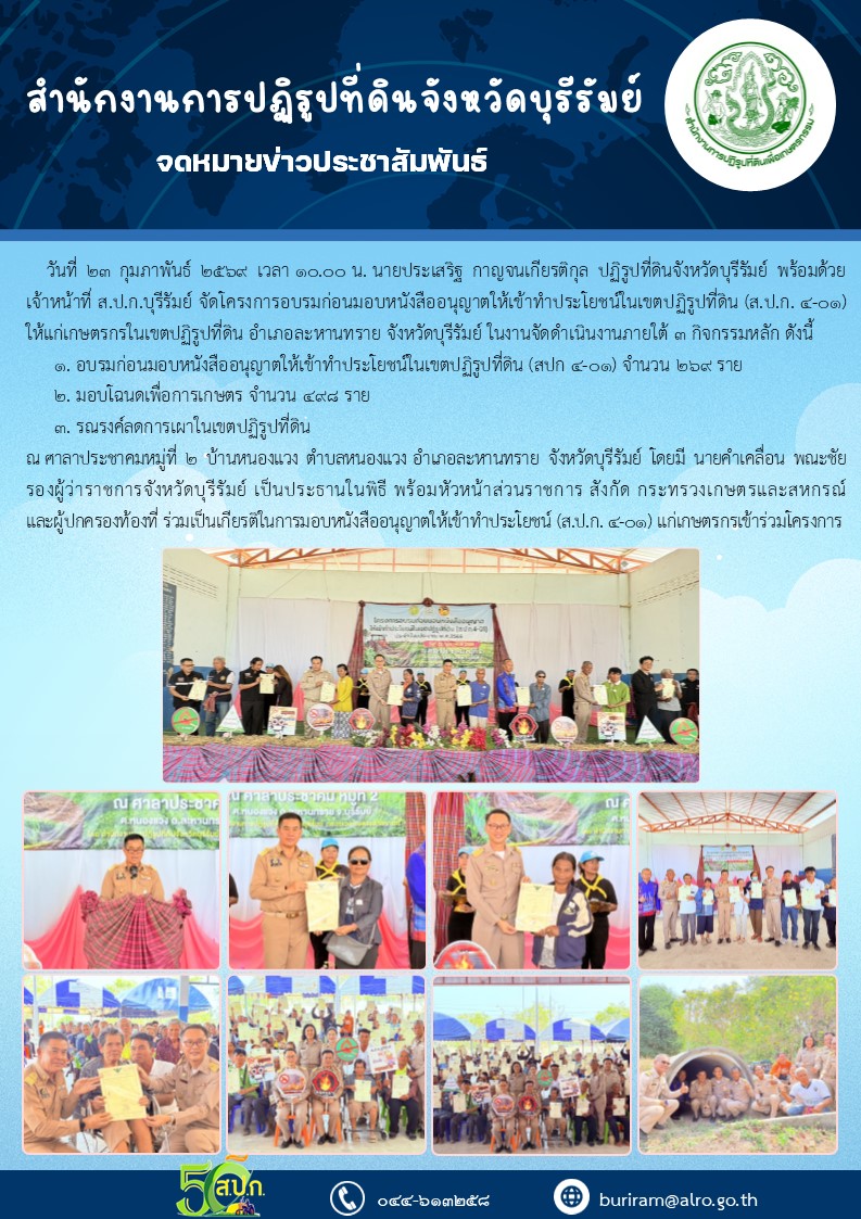 วันที่ 23 กุมภาพันธ์ 2569 นายประเสริฐ กาญจนเกียรติกุล ปฏิรูปที่ดินจังหวัดบุรีรัมย์ พร้อมเจ้าหน้าที่ ส.ป.ก.บุรีรัมย์ จัดโครงการอบรมก่อนมอบหนังสืออนุญาตให้เข้าทำประโยชน์ในเขตปฏิรูปที่ดิน (ส.ป.ก. 4-01) โดยมีนายคำเคลื่อน พณะชัย รองผู้ว่าราชการจังหวัดบุรีรัมย์ เป็นประธานในการมอบ ส.ป.ก. 4-01, โฉนดเพื่อการเกษตร แก่เกษตรกรที่เข้าร่วมโครงการ และร่วมรณรงค์ลดการเผาในเขตปฏิรูปที่ดิน