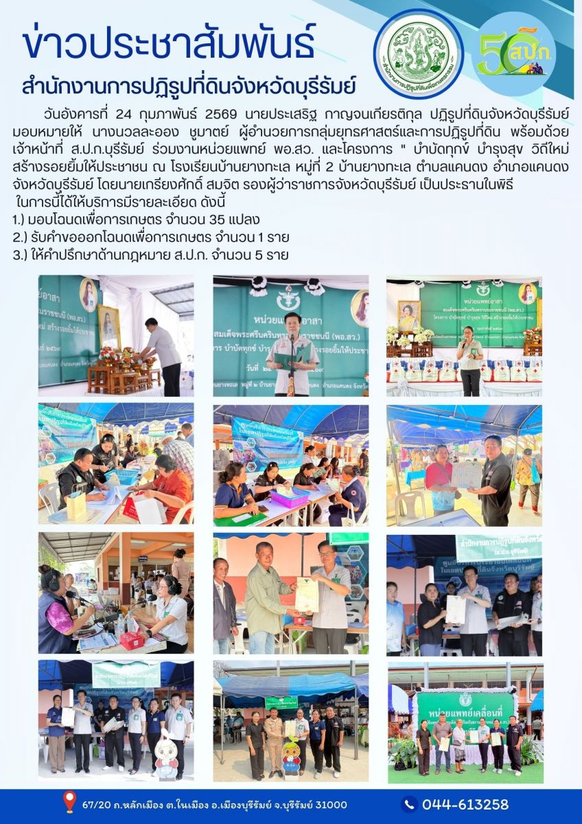 วันศุกร์ที่ 20 กุมภาพันธ์ 2569 นายประเสริฐ กาญจนเกียรติกุล ปฏิรูปที่ดินจังหวัดบุรีรัมย์ มอบหมายให้นางนวลละออง ชูมาตย์ ผู้อำนวยการกลุ่มยุทธศาสตร์ฯ พร้อมด้วยเจ้าหน้าที่ ส.ป.ก.บุรีรัมย์ ร่วงงานหน่วยแพทย์ พอ.สว. และโครงการบำบัดทุกข์ บำรุงสุข วิถีใหม่ สร้างรอยยิ้มให้ประชาชน