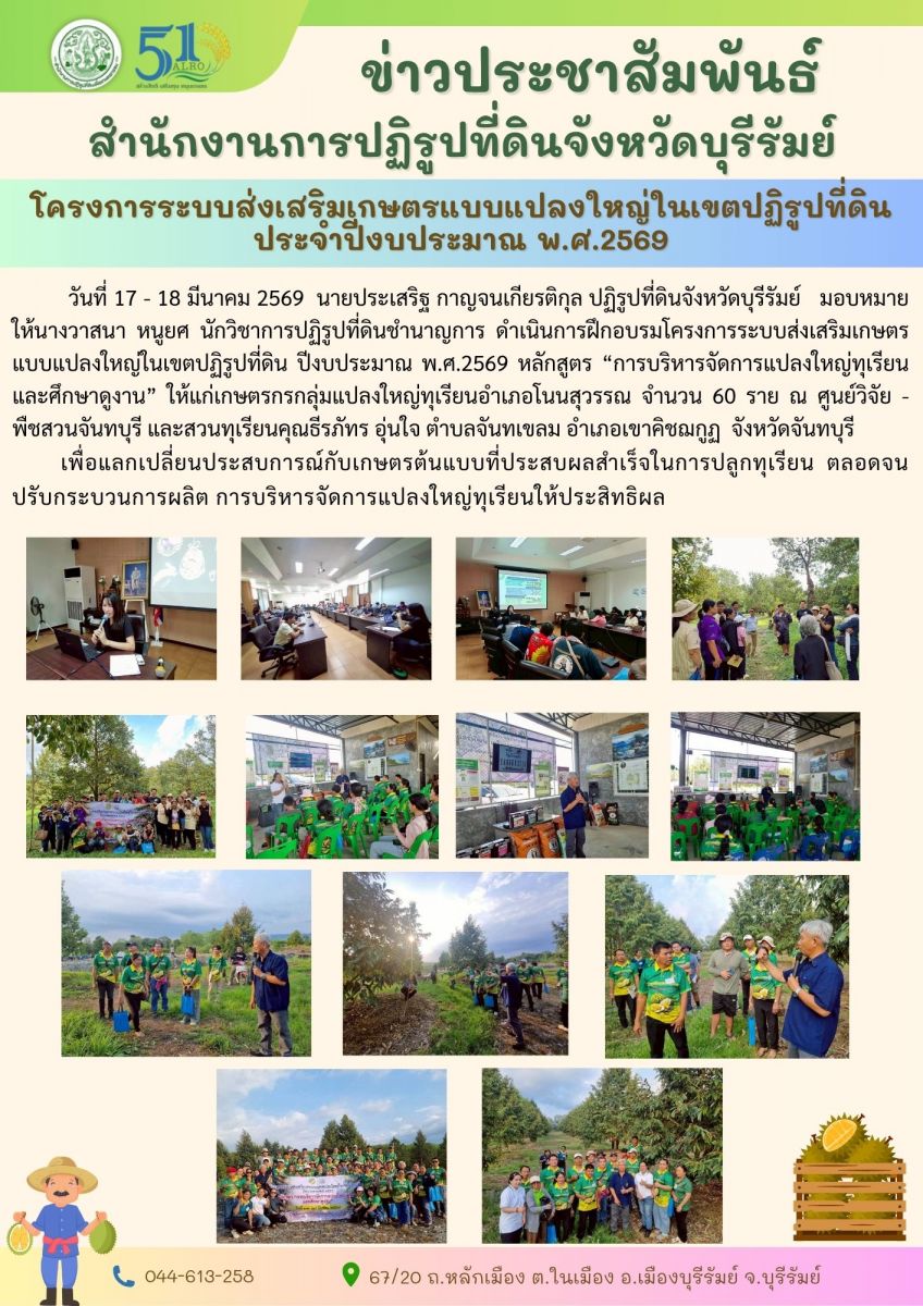 วันที่ 17-18 มีนาคม 2569 นายประเสริฐ กาญจนเกียรติกุล ปฏิรูปที่ดินจังหวัดบุรีรัมย์ มอบหมายให้ นางวาสนา หนูยศ นักวิชาการปฏิรูปที่ดินชำนาญการ ดำเนินการฝึกอบรมโครงการระบบส่งเสริมเกษตรแบบแปลงใหญ่ในเขตปฏิรูปที่ดิน ปีงบประมาณ พ.ศ. 2569 หลักสูตร "การบริหารจัดการแปลงใหญ่ทุเรียน" และศึกษาดูงาน ณ ศูนย์วิจัยพืชสวนจันทบุรี และสวนทุเรียนคุณธีรภัทร อุ่นใจ จังหวัดจันทบุรี