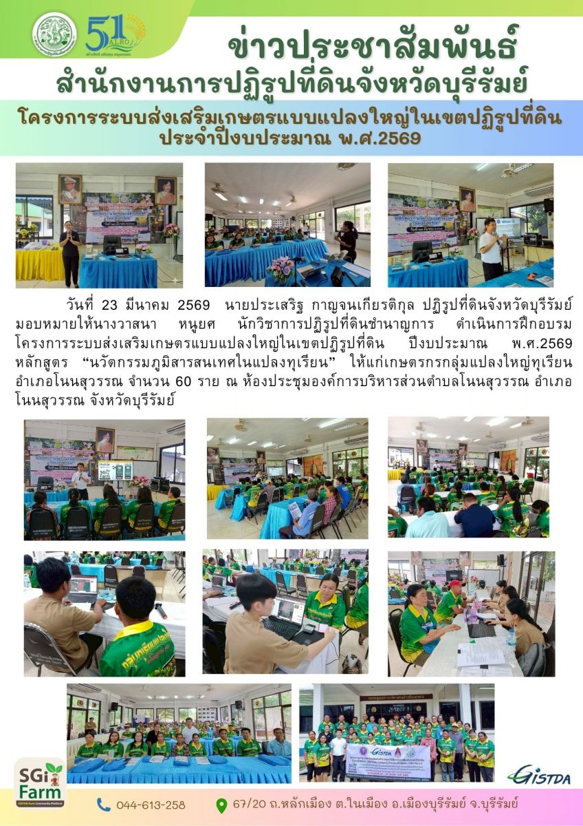 วันที่ 23 มีนาคม 2569 นายประเสริฐ กาญจนเกียรติกุล ปฏิรูปที่ดินจังหวัดบุรีรัมย์ มอบหมายให้ นางวาสนา หนูยศ นักวิชาการปฏิรูปที่ดินชำนาญการ ดำเนินการฝึกอบรมโครงการระบบส่งเสริมเกษตรแบบแปลงใหญ่ในเขตปฏิรูปที่ดิน ปีงบประมาณ พ.ศ. 2569 หลักสูตร "นวัตกรรมภูมิสารสนเทศในแปลงทุเรียน"