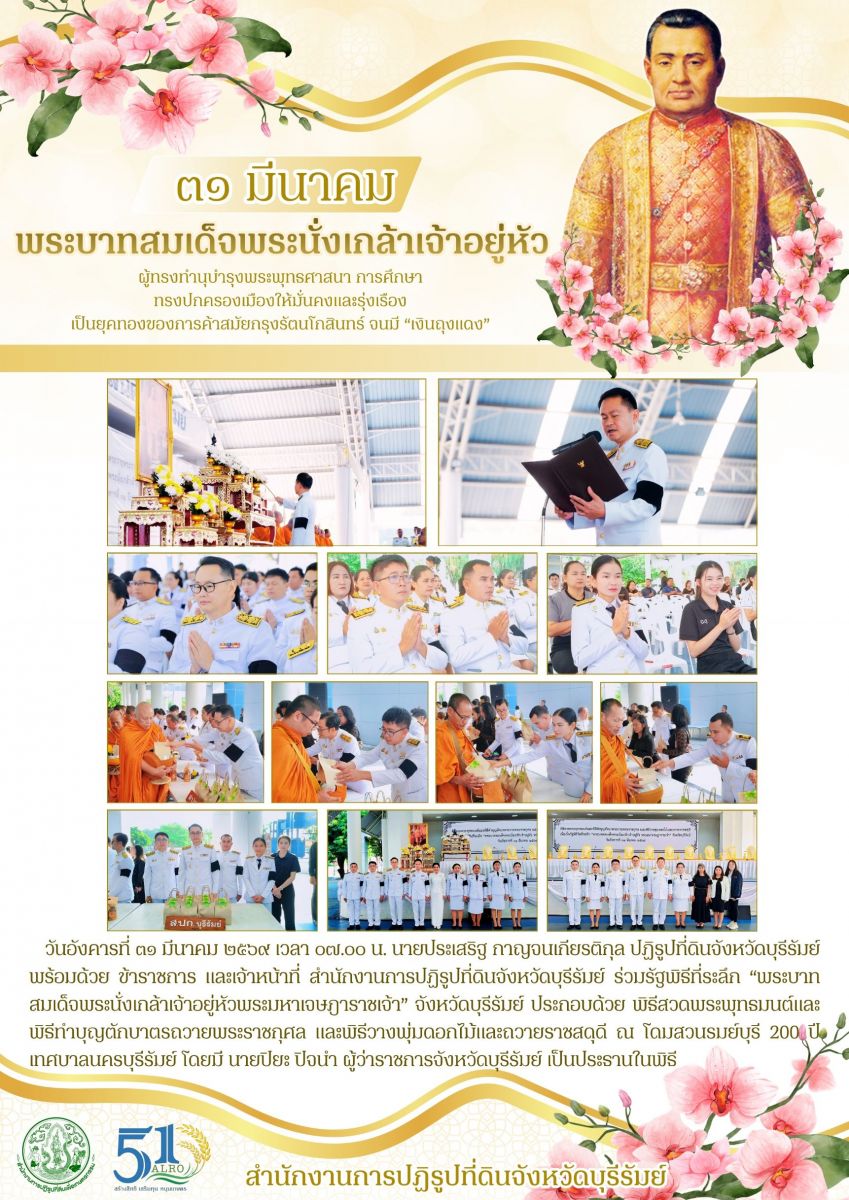 วันอังคารที่ 31 มีนาคม 2569 เวลา 07.00 น. นายประเสริฐ กาญจนเกียรติกุล ปฏิรูปที่ดินจังหวัดบุรีรัมย์ พร้อมด้วยเจ้าหน้าที่ ส.ป.ก.บุรีรัมย์ ร่วมรัฐพิธีที่ระลึก "พระบาทสมเด็จพระนั่งเกล้าเจ้าอยู่หัวพระมหาเจษฎาราชเจ้า" จังหวัดบุรีรัมย์