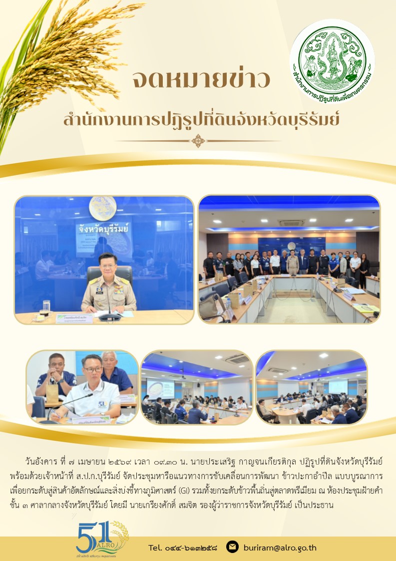 วันอังคารที่ 7 เมษายน 2569 เวลา 09.30 น. ส.ป.ก.บุรีรัมย์ จัดประชุมหารือแนวทางการขับเคลื่อนการพัฒนาข้าวปะกาอำปึล แบบบูรณาการเพื่อยกระดับข้าวพื้นถิ่นสู่ตลาดพรีเมียม