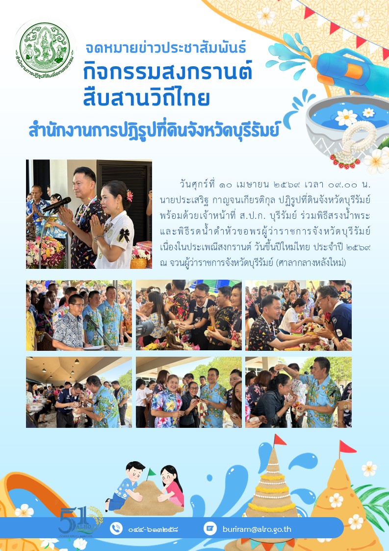 วันศุกร์ที่ 10 เมษายน 2569 นายประเสริฐ กาญจนเกียรติกุล ปฏิรูปที่ดินจังหวัดบุรีรัมย์ พร้อมด้วยเจ้าหน้าที่ ส.ป.ก.บุรีรัมย์ ร่วมพิธีสรงน้ำพระและพิธีรดน้ำดำหัวขอพรผู้ว่าราชการจังหวัดบุรีรัมย์เนื่องในประเพณีสงกรานต์ วันขึ้นปีใหม่ไทย ประจำปี 2569