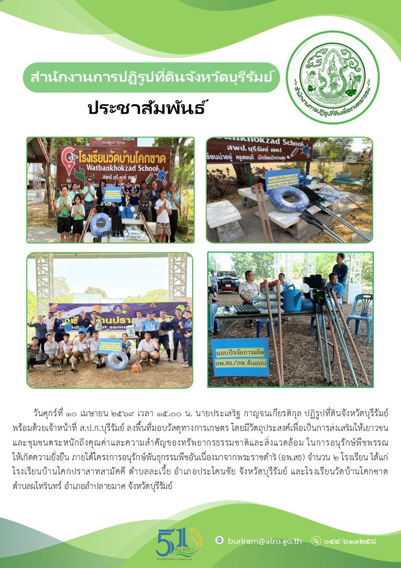 วันศุกร์ที่ 10 เมษายน 2569 เวลา 15.00 น. นายประเสริฐ กาญจนเกียรติกุล ปฏิรูปที่ดินจังหวัดบุรีรัมย์ ลงพื้นที่มอบวัสดุทางการเกษตรโครงการอนุรักษ์พันธุกรรมพืชอันเนื่องมาจากพระราชดำริ (อพ.สธ.) ฯ ในพื้นที่เขตปฏิรูปที่ดินจังหวัดบุรีรัมย์ ปีงบประมาณ พ.ศ. 2569 จำนวน 2 โรงเรียน