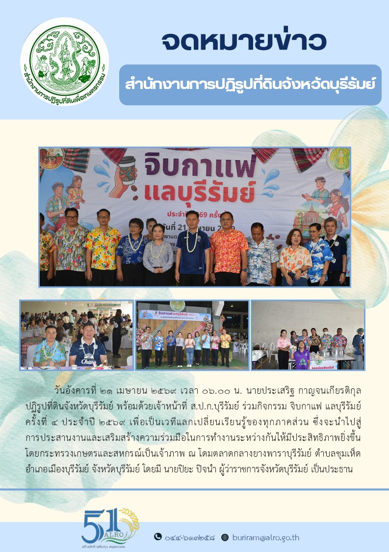 วันอังคารที่ 21 เมษายน 2569 เวลา 06.00 น. นายประเสริฐ กาญจนเกียรติกุล ปฏิรูปที่ดินจังหวัดบุรีรัมย์ พร้อมเจ้าหน้าที่่ ส.ป.ก.บุรีรัมย์ ร่วมกิจกรรม จิบกาแฟ แลบุรีรัมย์ ครั้งที่ 4 ประจำปี 2569
