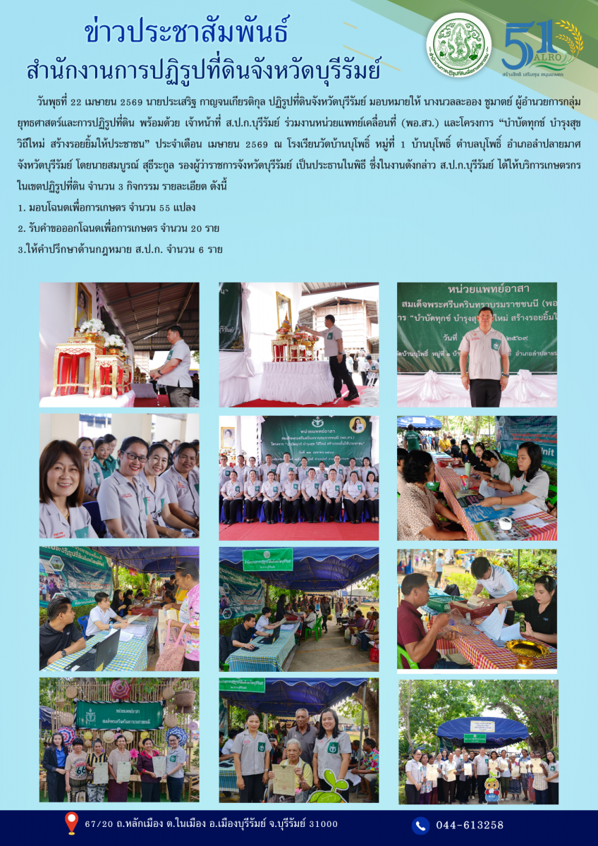 วันที่ 22 เมษายน 2569 นายประเสริฐ กาญจนเกียรติกุล ปฏิรูปที่ดินจังหวัดบุรีรัมย์ มอบหมายให้นางนวลละออง ชูมาตย์ ผู้อำนวยการกลุ่มยุทธศาสตร์และการปฏิรูปที่ดิน พร้อมเจ้าหน้าที่ ส.ป.ก.บุรีรัมย์ ร่วมงานหน่วยแพทย์เคลื่อนที่ (พอ.สว.) และโครงการ "บำบัดทุกข์ บำรุงสุข วิถีใหม่ สร้างรอยยิ้มให้ประชาชน" ประจำเดือนเมษายน 2569