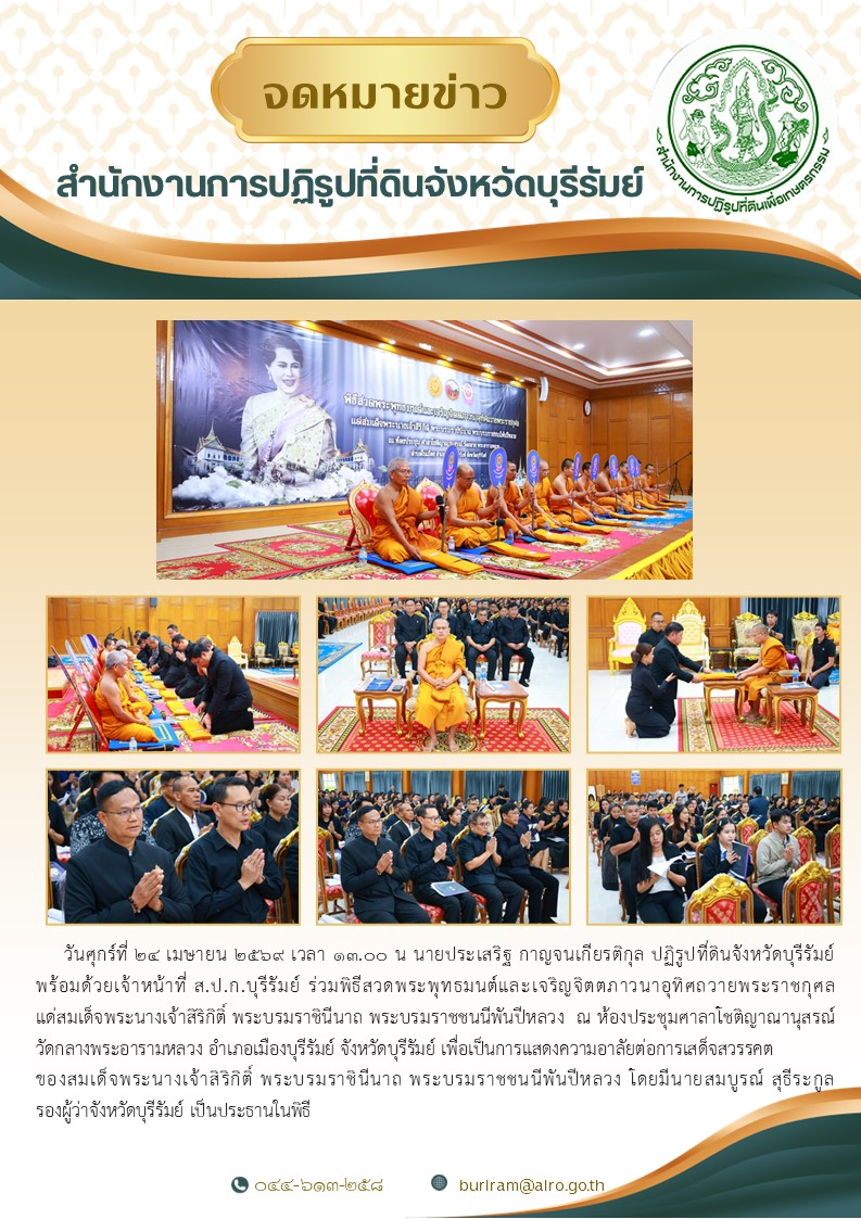 วันศุกร์ที่ 24 เมษายน 2569 นายประเสริฐ กาญจนเกียรติกุล ปฏิรูปที่ดินจังหวัดบุรีรัมย์ พร้อมเจ้าหน้าที่ ส.ป.ก.บุรีรัมย์ร่วมพิธีสวดพระพุทธมนต์และเจริญจิตภาวนาอุทิศถวายพระราชกุศลแด่สมเด็จพระนางเจ้าสิริกิติ์ พระบรมราชินีนาถ พระบรมราชชนนีพันปีหลวง