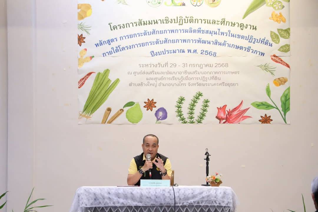 วันที่ 30 กรกฎาคม 2568 นายสุรชัย ยุทธชนะ รองเลขาธิการสำนักงานการปฏิรูปที่ดินเพื่อเกษตรกรรม เป็นประธานในพิธีเปิดโครงการสัมมนาเชิงปฏิบัติการและศึกษาดูงาน หลักสูตร “การยกระดับศักยภาพการผลิตพืชสมุนไพรในเขตปฏิรูปที่ดินภายใต้โครงการยกระดับศักยภาพการพัฒนาสินค้าเกษตรชีวภาพ ปีงบประมาณ พ.ศ. 2568” โดยมี นางญานิชศา ธงนำชัยมา ผู้อำนวยการศูนย์การเรียนรู้เพื่อการปฏิรูปที่ดิน เป็นผู้กล่าวรายงาน พร้อมด้วย นางสาวสิริมา แจ้งกระจ่าง ผู้อำนวยการศูนย์ส่งเสริมและพัฒนาอาชีพเสริมนอกภาคการเกษตร ให้การต้อนรับ และได้รับเกียรติจาก ดร.อาทิตยา พองพรหม ผู้เชี่ยวชาญด้านการเพิ่มประสิทธิภาพการใช้ที่ดินในเขตปฏิรูปที่ดิน เป็นวิทยากรบรรยาย เรื่อง นโยบายและทิศทางการส่งเสริมสมุนไพรในเขตปฏิรูปที่ดิน ณ หอประชุมหม่อมราชวงศ์หญิงรสลิน คัคณางค์ ศูนย์ส่งเสริมและพัฒนาอาชีพเสริมภาคการเกษตร อำเภอบางไทร จังหวัดพระนครศรีอยุธยา