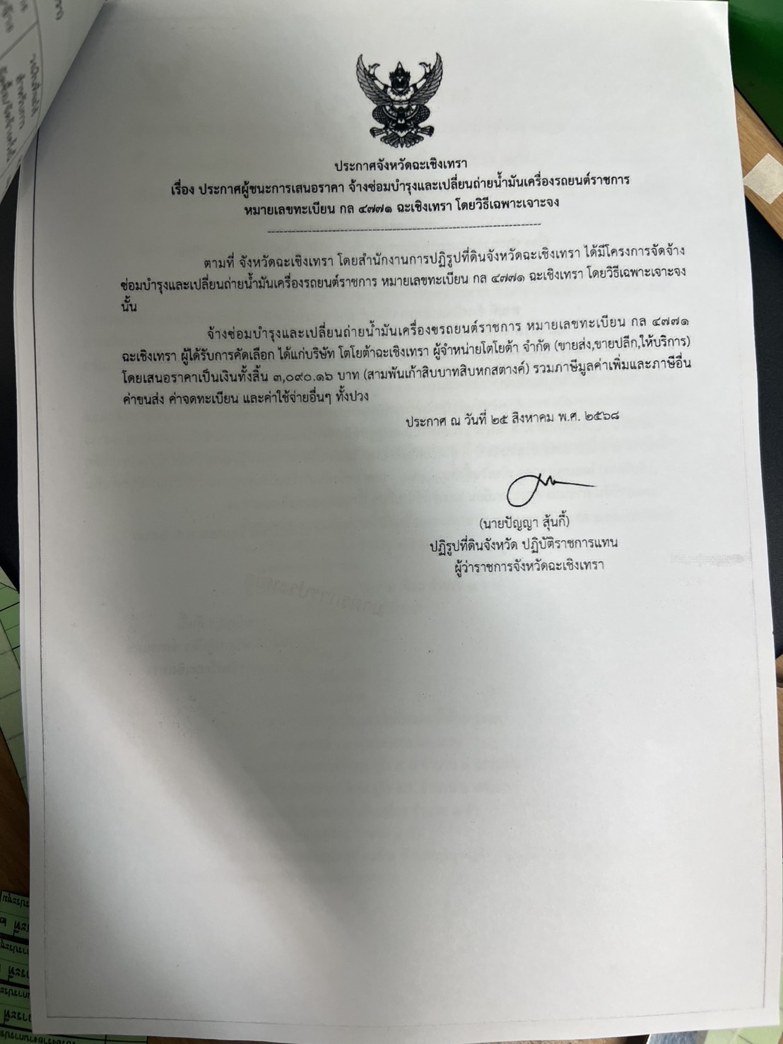 ประกาศจังหวัดฉะเชิงเทรา เรื่อง ประกาศผู้ชนะการเสนอราคา จ้างซ่อมบำรุงและเปลี่ยนถ่ายน้ำมันเครื่องรถยนต์ราชการ หมายเลขทะเบียน กล ๔๗๗๑ ฉะเชิงเทรา โดยวิธีเฉพาะเจาะจง