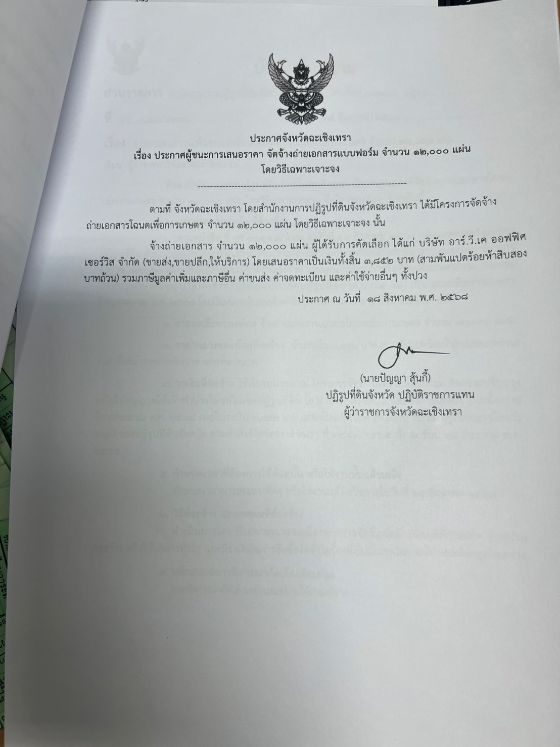 ประกาศจังหวัดฉะเชิงเทรา เรื่อง ประกาศผู้ชนะการเสนอราคา จัดจ้างถ่ายเอกสารแบบฟอร์ม จำนวน ๑๒,๐๐๐ แผ่น โดยวิธีเฉพาะเจาะจง