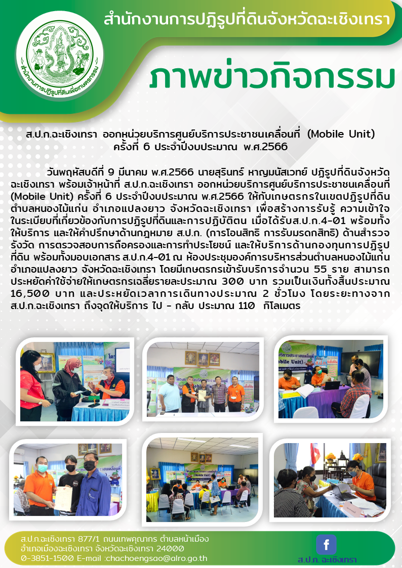 ส.ป.ก.ฉะเชิงเทรา ออกหน่วยบริการศูนย์บริการประชาชนเคลื่อนที่ (Mobile Unit) ครั้งที่ 6 ประจำปีงบประมาณ พ.ศ.2566