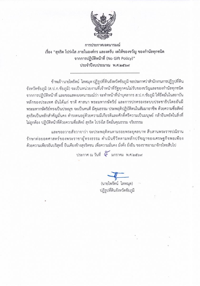 การประกาศเจตนารมณ์ เรื่อง "สุจริต โปร่งใส ภายในองค์กร และงดรับ งดใช้ของขวัญ ของกำนัลทุกชนิด จากการปฏิบัติหน้าที่ (No Gift Policy)" ประจำปีงบประมาณ พ.ศ.2569