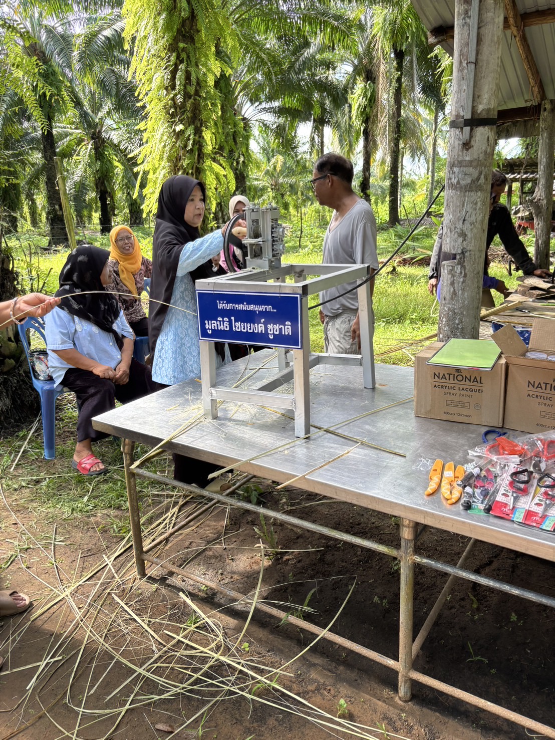 มูลนิธิฯสนับสนุนให้เครื่องผลิตเส้นตอกปาล์มน้ำมัน ตัวเครื่องสามารถใช้งานได้ 2 โหมด คือใช้ไฟฟ้า และมือหมุน (ไม่ต้องใช้แรงเยอะ ผู้หญิงหมุนได้)