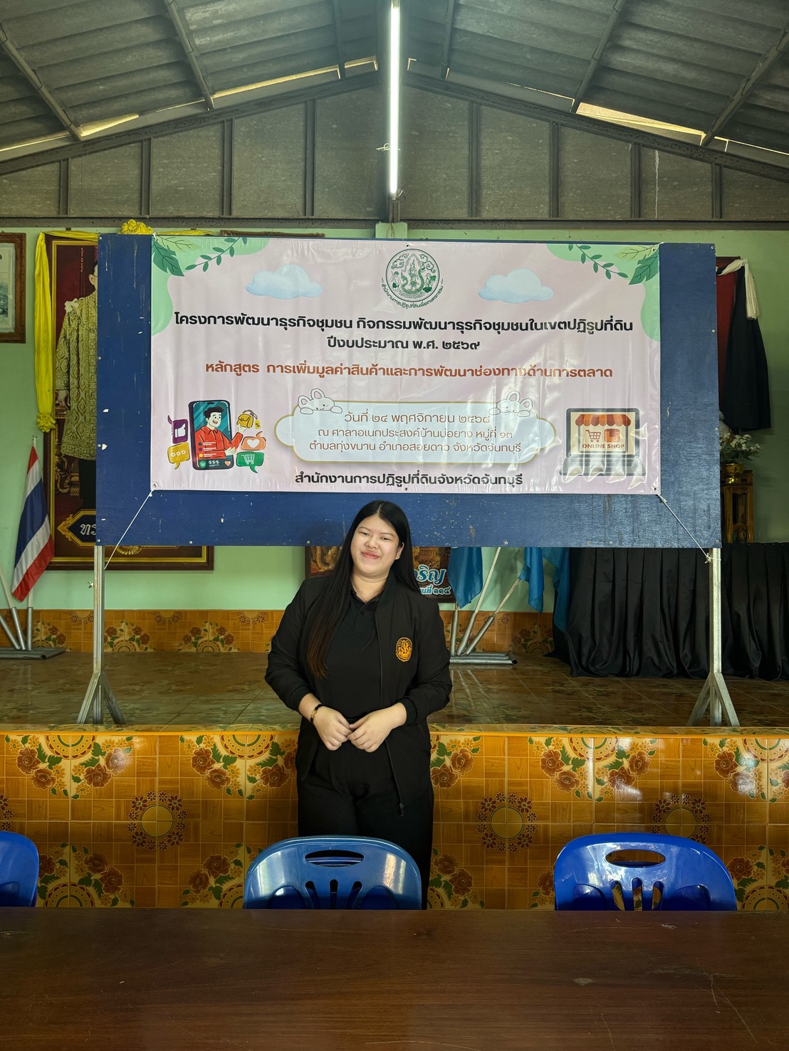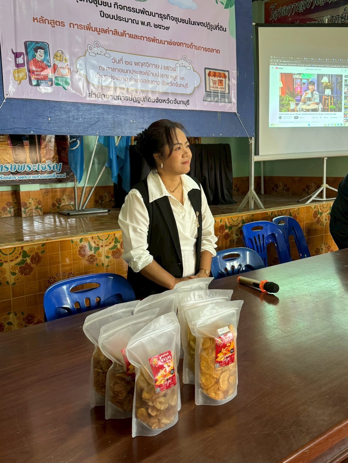 วันจันทร์ที่ 24 พฤศจิกายน 2568 นางสาวอัญชัญ วงษ์ปรีชา นักวิชาการปฏิรูปที่ดินชำนาญการ รักษาราชการแทน ปฏิรูปที่ดินจังหวัดจันทบุรี มอบหมายให้กลุ่มยุทธศาสตร์และการปฏิรูปที่ดิน ดำเนินการจัดฝึกอบรมโครงการพัฒนาธุรกิจชุมชน กิจกรรมพัฒนาธุรกิจชุมชนในเขตปฏิรูปที่ดิน ปีงบประมาณพ.ศ.2569 หลักสูตรการเพิ่มมูลค่าสินค้าและการพัฒนาช่องทางด้านการตลาด จำนวน 15 ราย ซึ่งมี นางดลนภา กัดมั่น เป็นวิทยากรในการฝึกอบรม ณ ศาลาอเนกประสงค์บ้านบ่อยาง หมู่ที่ 13 ตำบลทุ่งขนาน อำเภอสอยดาว จังหวัดจันทบุรี