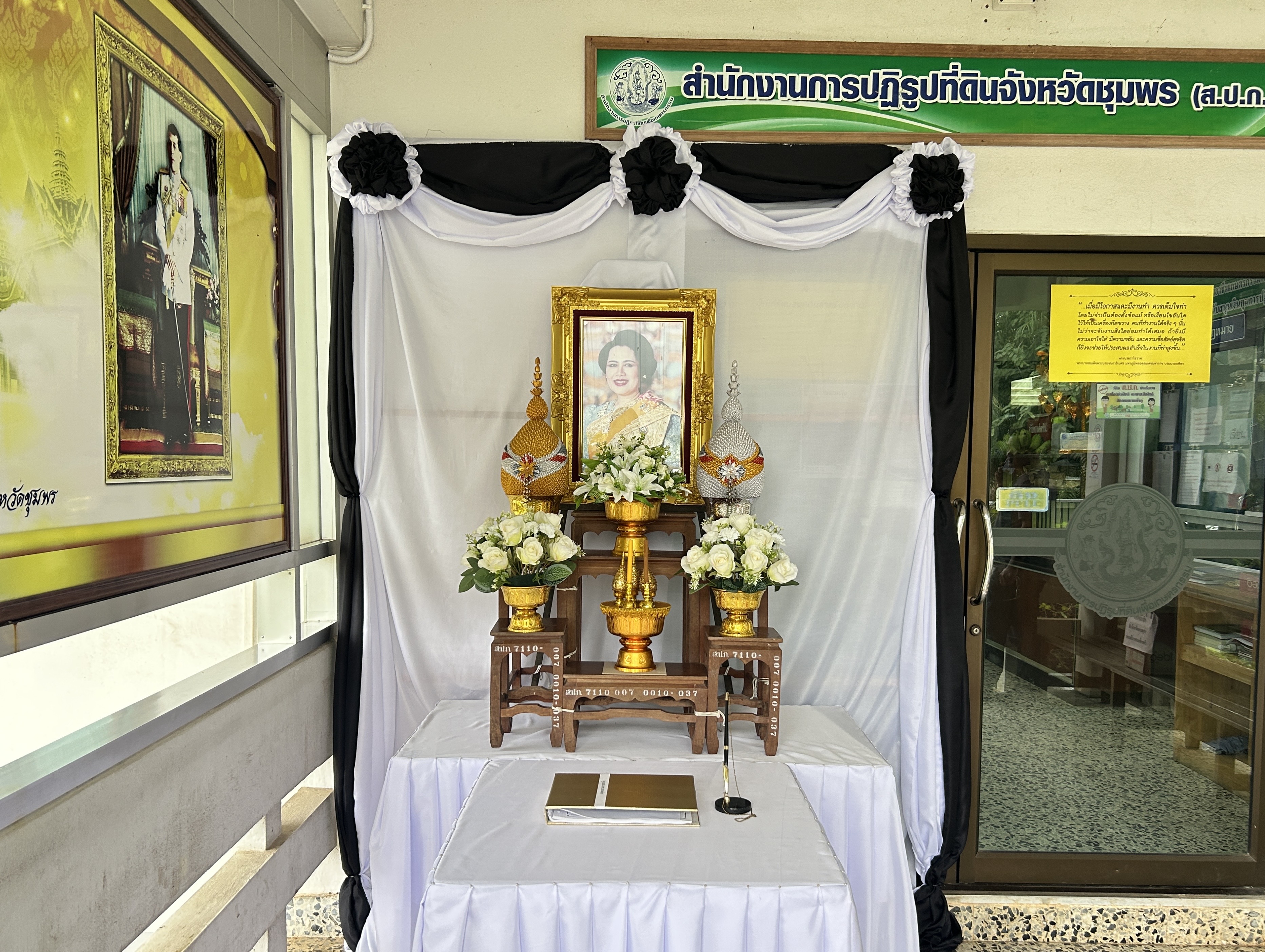 ทั้งนี้ สำนักงานการปฏิรูปที่ดินจังหวัดชุมพร ได้จัดสมุดลงนามถวายความอาลัย สมเด็จพระนางเจ้าสิริกิติ์ พระบรมราชินีนาถ พระบรมราชชนนีพันปีหลวง ให้แก่บุคคลากรและประชาชน ณ อาคารสำนักงานการปฏิรูปที่ดินจังหวัดชุมพร ตำบลนาชะอัง อำเภอเมืองชุมพร จังหวัดชุมพร ตั้งแต่วันนี้เป็นต้นไป