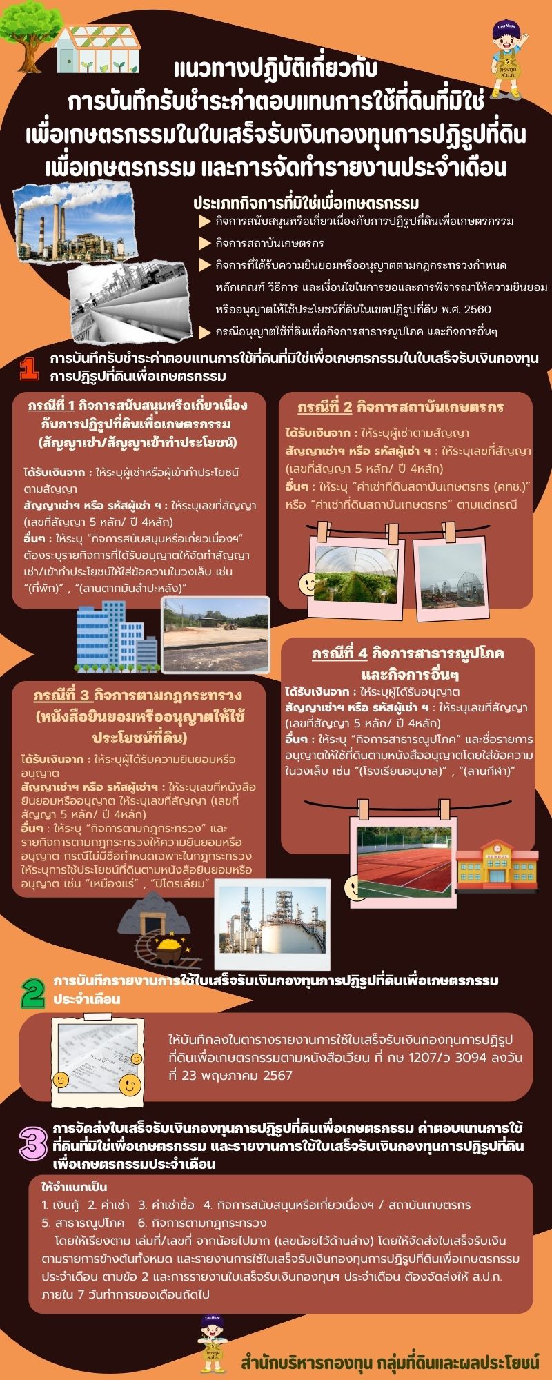 สำนักบริหารกองทุน ขอเผยแพร่ความรู้ของกองทุนการปฏิรูปที่ดินเพื่อเกษตรกรรม ประจำปีบัญชี 2568 เรื่อง “แนวทางปฏิบัติเกี่ยวกับการบันทึกรับชำระค่าตอบแทนการใช้ที่ดินที่มิใช่เพื่อเกษตรกรรมในใบเสร็จรับเงินกองทุนการปฏิรูปที่ดินเพื่อเกษตรกรรม และการจัดทำรายงานประจำเดือน”