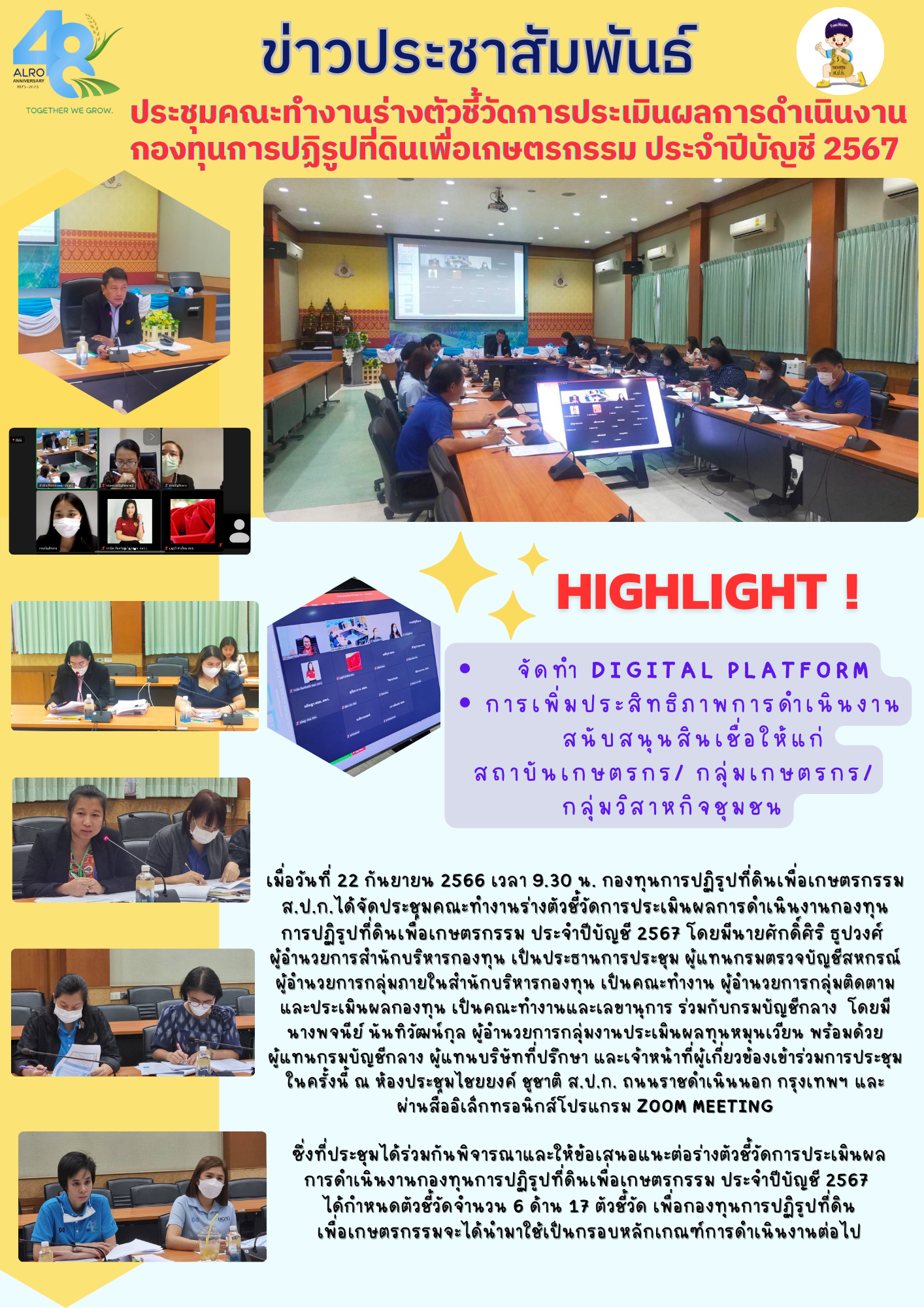 เมื่อวันที่ 22 กันยายน 2566 เวลา 9.30 น. กองทุนการปฏิรูปที่ดินเพื่อเกษตรกรรม ส.ป.ก.ได้จัดประชุมคณะทำงานร่างตัวชี้วัดการประเมินผลการดำเนินงานกองทุนการปฏิรูปที่ดินเพื่อเกษตรกรรม ประจำปีบัญชี 2567 โดยมีนายศักดิ์ศิริ ธูปวงศ์ ผู้อำนวยการสำนักบริหารกองทุน เป็นประธานการประชุม ผู้แทนกรมตรวจบัญชีสหกรณ์ ผู้อำนวยการกลุ่มภายในสำนักบริหารกองทุน เป็นคณะทำงาน ผู้อำนวยการกลุ่มติดตามและประเมินผลกองทุน เป็นคณะทำงานและเลขานุการ ร่วมกับกรมบัญชีกลาง โดยมีนางพจนีย์ นันทิวัฒน์กุล ผู้อำนวยการกลุ่มงานประเมินผลทุนหมุนเวียน พร้อมด้วยผู้แทนกรมบัญชีกลาง ผู้แทนบริษัทที่ปรึกษา และเจ้าหน้าที่ผู้เกี่ยวข้องเข้าร่วมการประชุมในครั้งนี้ ณ ห้องประชุมไชยยงค์ ชูชาติ ส.ป.ก. ถนนราชดำเนินนอก กรุงเทพฯ และผ่านสื่ออิเล็กทรอนิกส์โปรแกรม Zoom Meeting