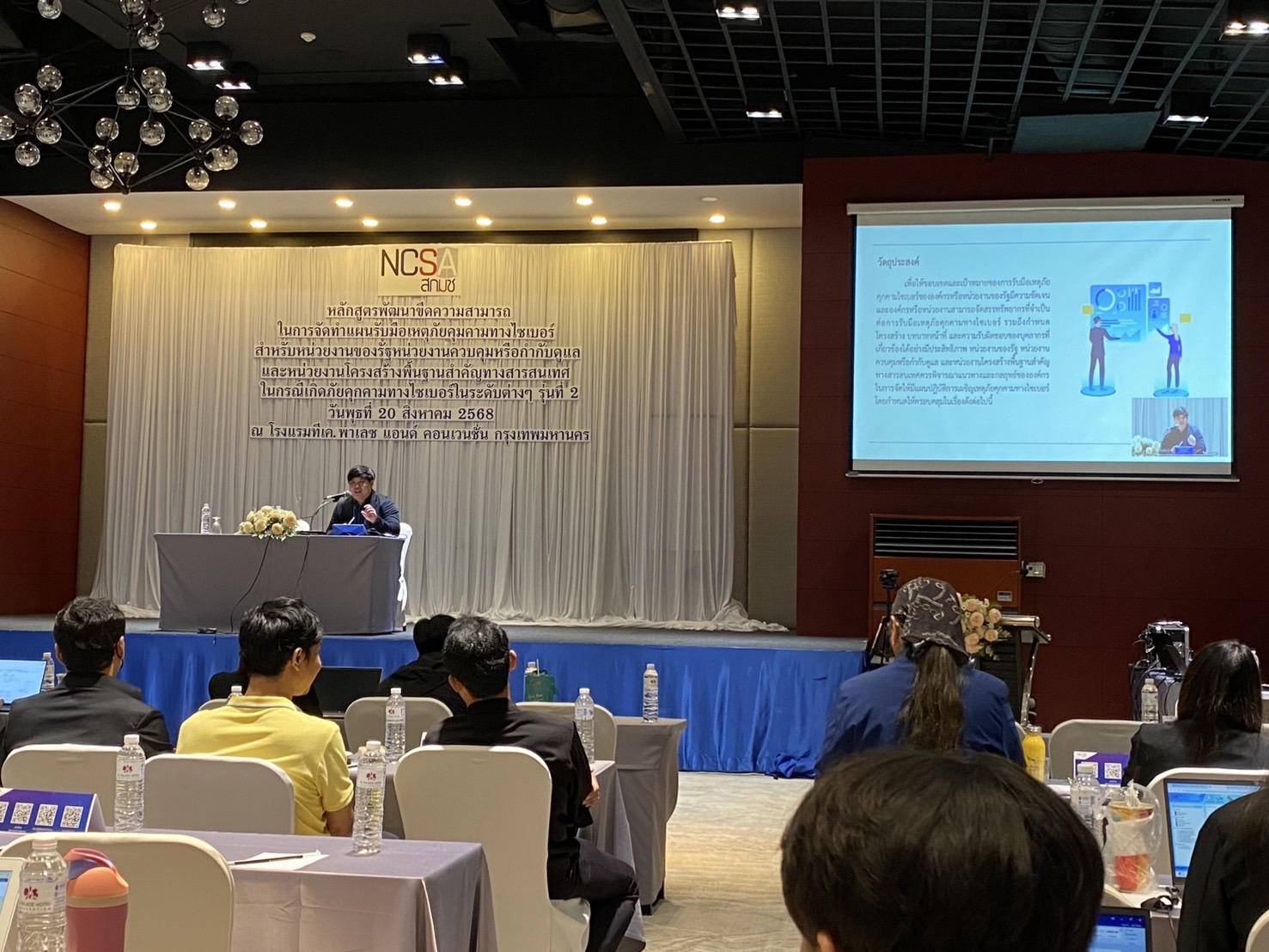วันพุธที่ 20 สิงหาคม 2568 เวลา 09.00 น. นายศตวรรษ แก้วขาว พร้อมด้วยนายธนัท จำปาโชติ นักวิชาการคอมพิวเตอร์ปฏิบัติการ กลุ่มระบบคอมพิวเตอร์และเครือข่าย (กรค.) อบรมเชิงปฏิบัติการ หลักสูตรพัฒนาขีดความสามารถในการจัดทำแผนรับมือเหตุภัยคุกคามทางไซเบอร์ สำหรับหน่วยงานของรัฐ หน่วยงานควบคุมหรือกำกับดูแล และหน่วยงานโครงสร้างพื้นฐานสำคัญทางสารสนเทศ ในกรณีเกิดเหตุภัยคุกคามทางไซเบอร์ในระดับต่าง ๆ รุ่นที่ 2 ณ โรงแรมทีเค พาเลซ แอนด์ คอนเวนชั่น กทม.