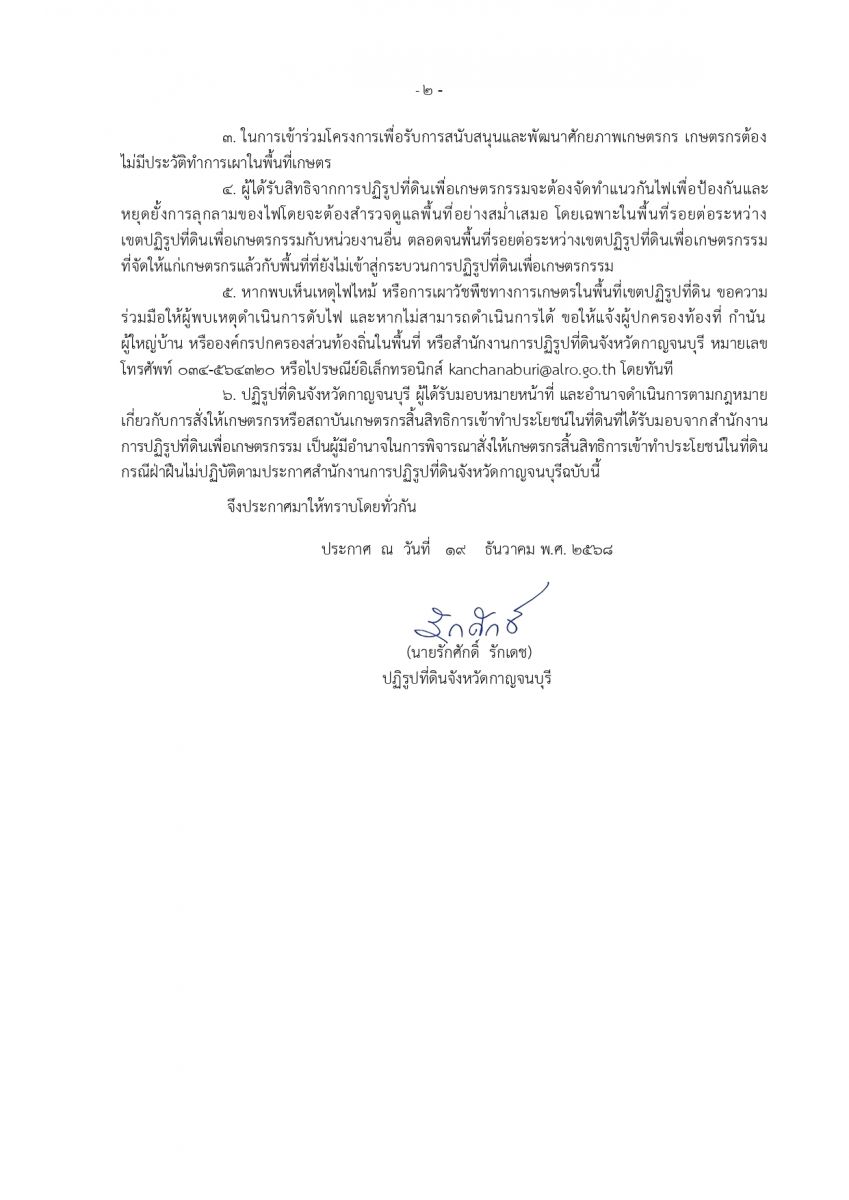 ประกาศสำนักงานการปฏิรูปที่ดินจังหวัดกาญจนบุรี เรื่อง ห้ามเผา และให้จัดทำแนวกันไฟในพื้นที่เขตปฏิรูปที่ดินจังหวัดกาญจนบุรี