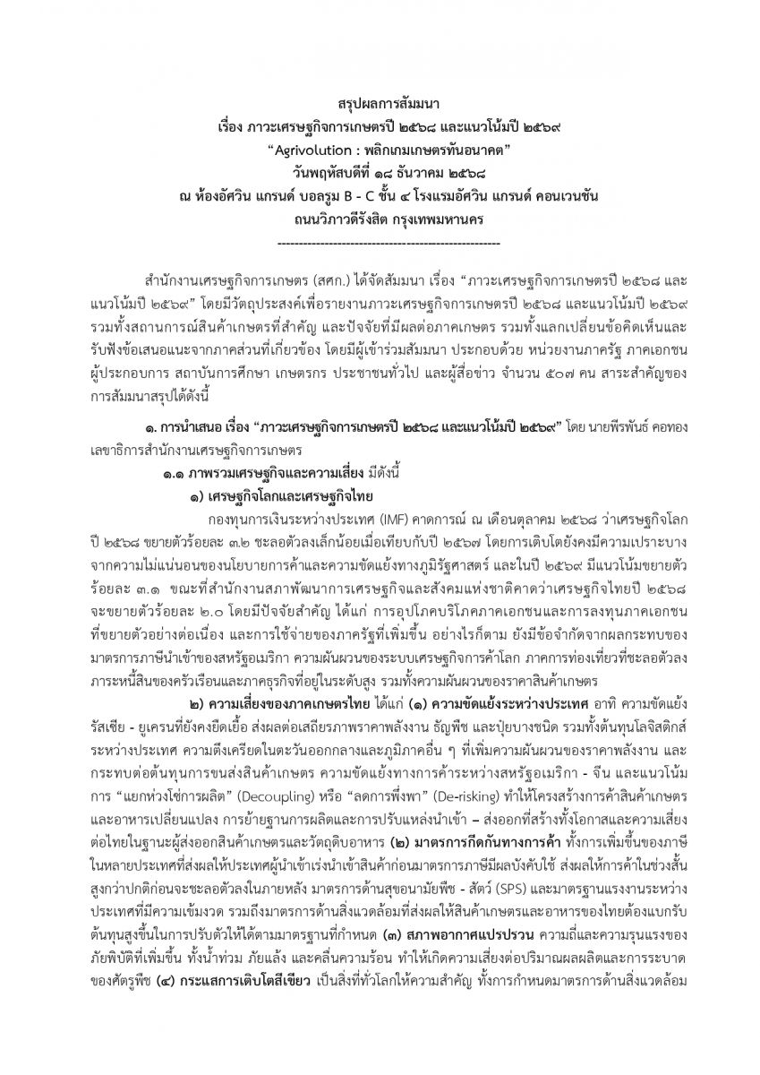 ประชาสัมพันธ์จากสำนักงานเศรษฐกิจการเกษตร สรุปผลการสัมมนา เรื่อง ภาวะเศรษฐกิจการเกษตรปี ๒๕68 และแนวโน้มปี ๒๕69 “Agrivolution : พลิกเกมเกษตรทันอนาคต”