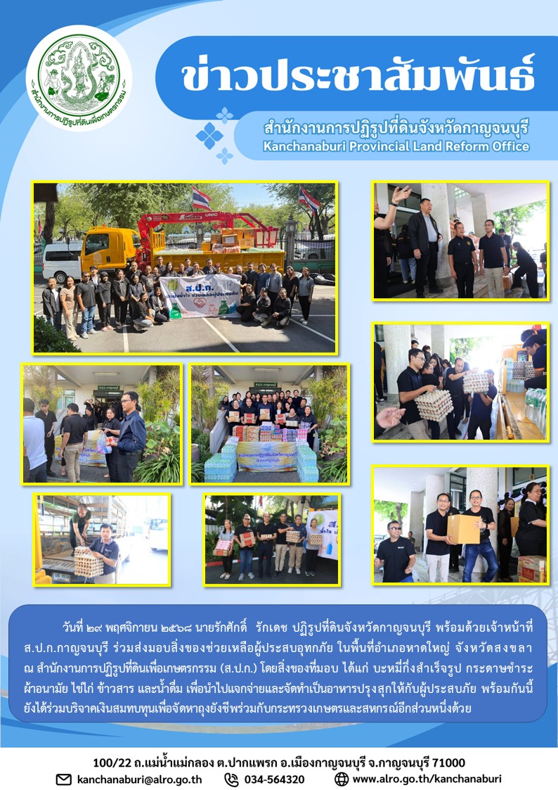 ส.ป.ก.กาญจนบุรี ร่วมส่งมอบสิ่งของช่วยเหลิือผู้ประสบอุทกภัย ในพื้นที่อำเภอหาดใหญ่ จังหวัดสงขลา