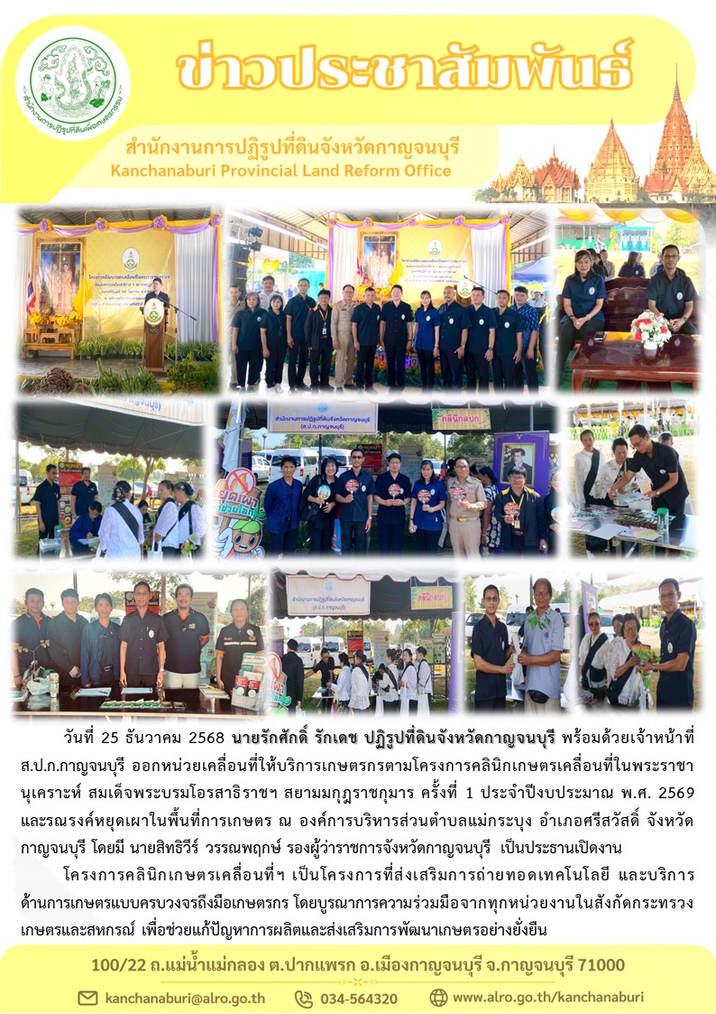 ปฏิรูปที่ดินจังหวัดกาญจนบุรี พร้อมด้วยเจ้าหน้าที่ ส.ป.ก.กาญจนบุรี ออกหน่วยเคลื่อนที่ให้บริการเกษตรกรตามโครงการคลินิกเกษตรเคลื่อนที่ในพระราชานุเคราะห์ สมเด็จพระบรมโอรสาธิราชฯ สยามมกุฎราชกุมาร ครั้งที่ 1 ประจำปีงบประมาณ พ.ศ. 2569 และรณรงค์หยุดเผาในพื้นที่การเกษตร ณ องค์การบริหารส่วนตำบลแม่กระบุง อำเภอศรีสวัสดิ์ จังหวัดกาญจนบุรี