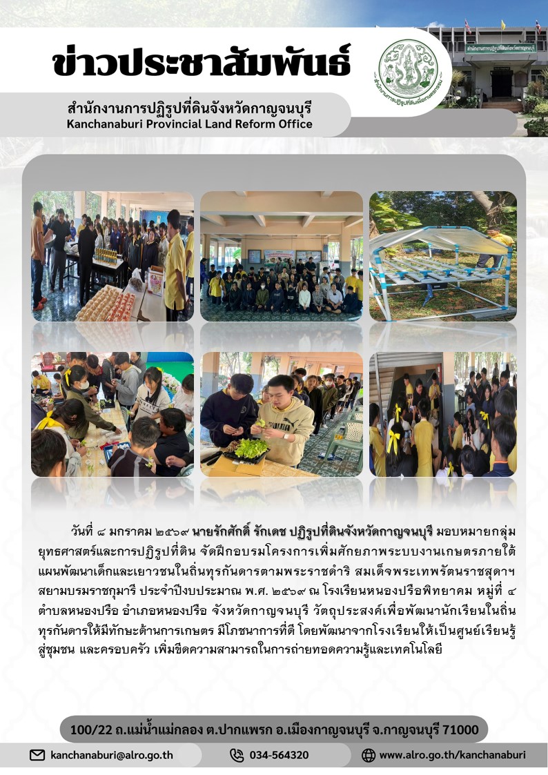 ส.ป.ก.กาญจนบุรี จัดฝึกอบรมโครงการเพิ่มศักยภาพระบบงานเกษตรภายใต้แผนพัฒนาเด็กและเยาวชนในถิ่นทุรกันดารตามพระราชดำริ สมเด็จพระเทพรัตนราชสุดาฯ สยามบรมราชกุมารี ประจำปีงบประมาณ พ.ศ.2569