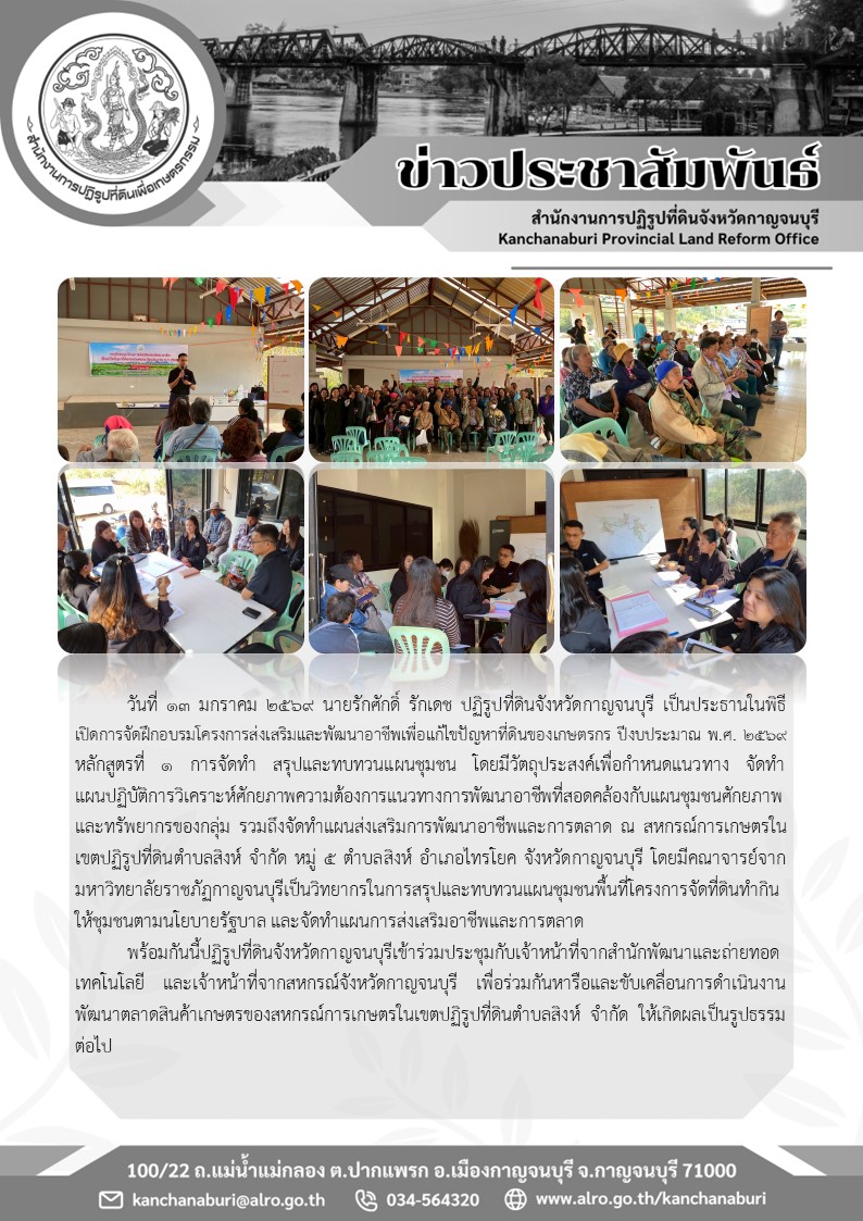 ปฎิรูปที่ดินจังหวัดกาญจนบุรี เป็นประธานเปิดการฝึกอบรมเกษตรกรโครงการส่งเสริมและพัฒนาอาชีพเพื่อแก้ไขปัญหาที่ดินของเกษตรกร ปีงบประมาณพ.ศ.2569 หลักสูตรที่ 1 การจัดทำ สรุปและทบทวนแผนชุมชน