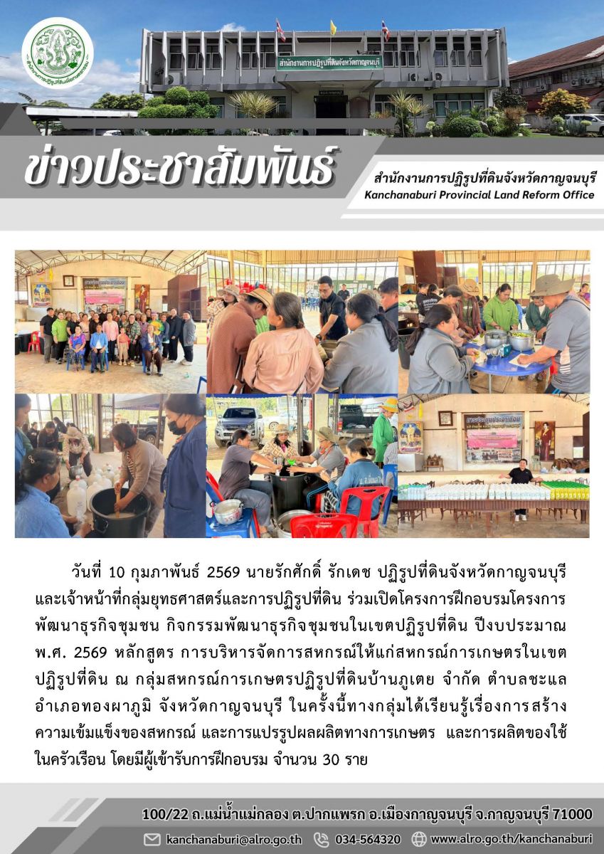 ส.ป.ก.กาญจนบุรี จัดฝึกอบรมเกษตรกรโครงการพัฒนาธุรกิจชุมชน กิจกรรมพัฒนาธุรกิจชุมชนในเขตปฏิรูปที่ดิน เมื่อวันที่ 10 กุมภาพันธ์ 2569 ณ กลุ่มสหกรณ์การเกษตรปฏิรูปที่ดินบ้านภูเตย จำกัด ต.ชะแล อ.ทองผาภูมิ จ.กาญจนบุรี