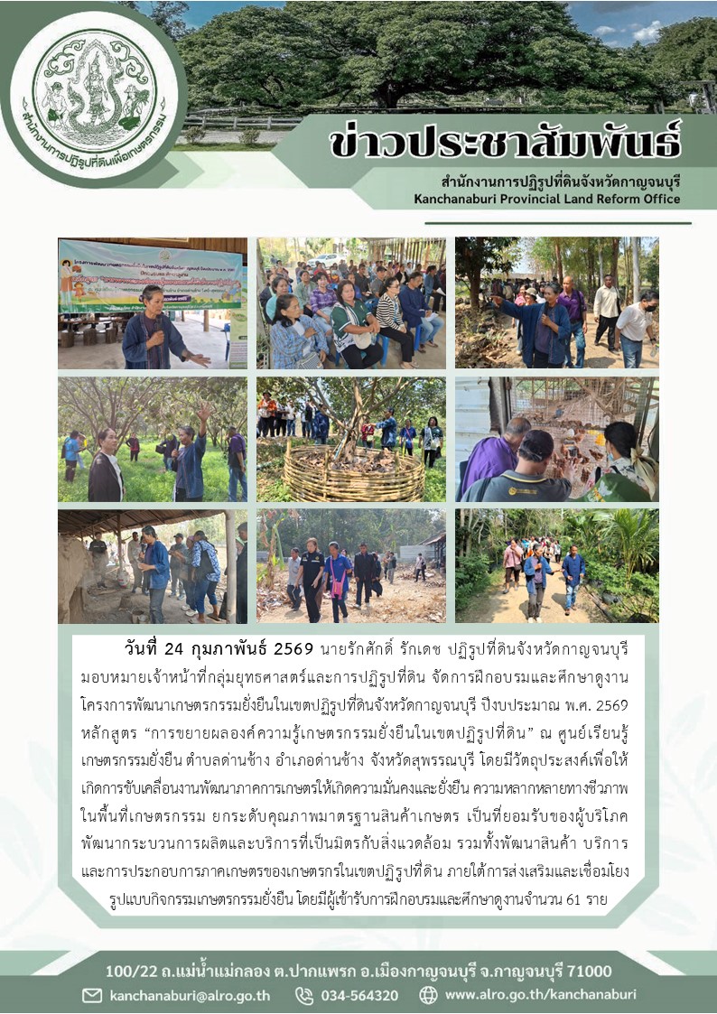 ส.ป.ก.กาญจนบุรี จัดฝึกอบรมและศึกษาดูงาน โครงการพัฒนาเกษตรกรรมยั่งยืนในเขตปฏิรูปที่ดินจังหวัดกาญจนบุรี ปีงบประมาณ พ.ศ. 2569 หลักสูตร “การขยายผลองค์ความรู้เกษตรกรรมยั่งยืนในเขตปฏิรูปที่ดิน”ณ ศูนย์เรียนรู้ เกษตรกรรมยั่งยืน ตำบลด่านช้าง อำเภอด่านช้าง จังหวัดสุพรรณบุรี