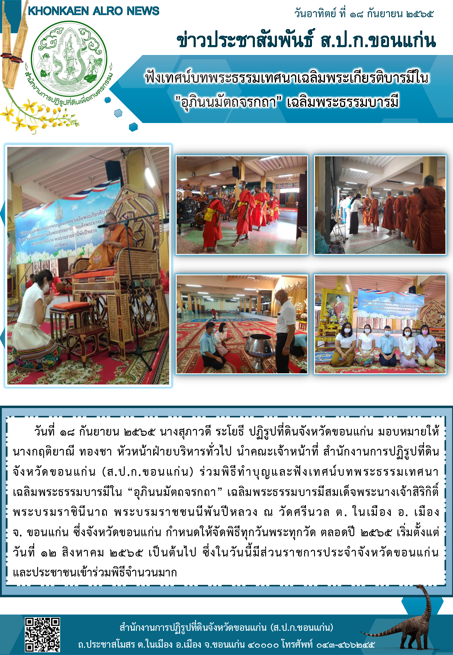 ส.ป.ก.ขอนแก่น เข้าร่วมฟังเทศน์บทพระธรรมเทศนาเฉลิมพระเกียรติบารมีใน "อุภินนมัตถจรกถา" เฉลิมพระธรรมบารมี 18-09-2565