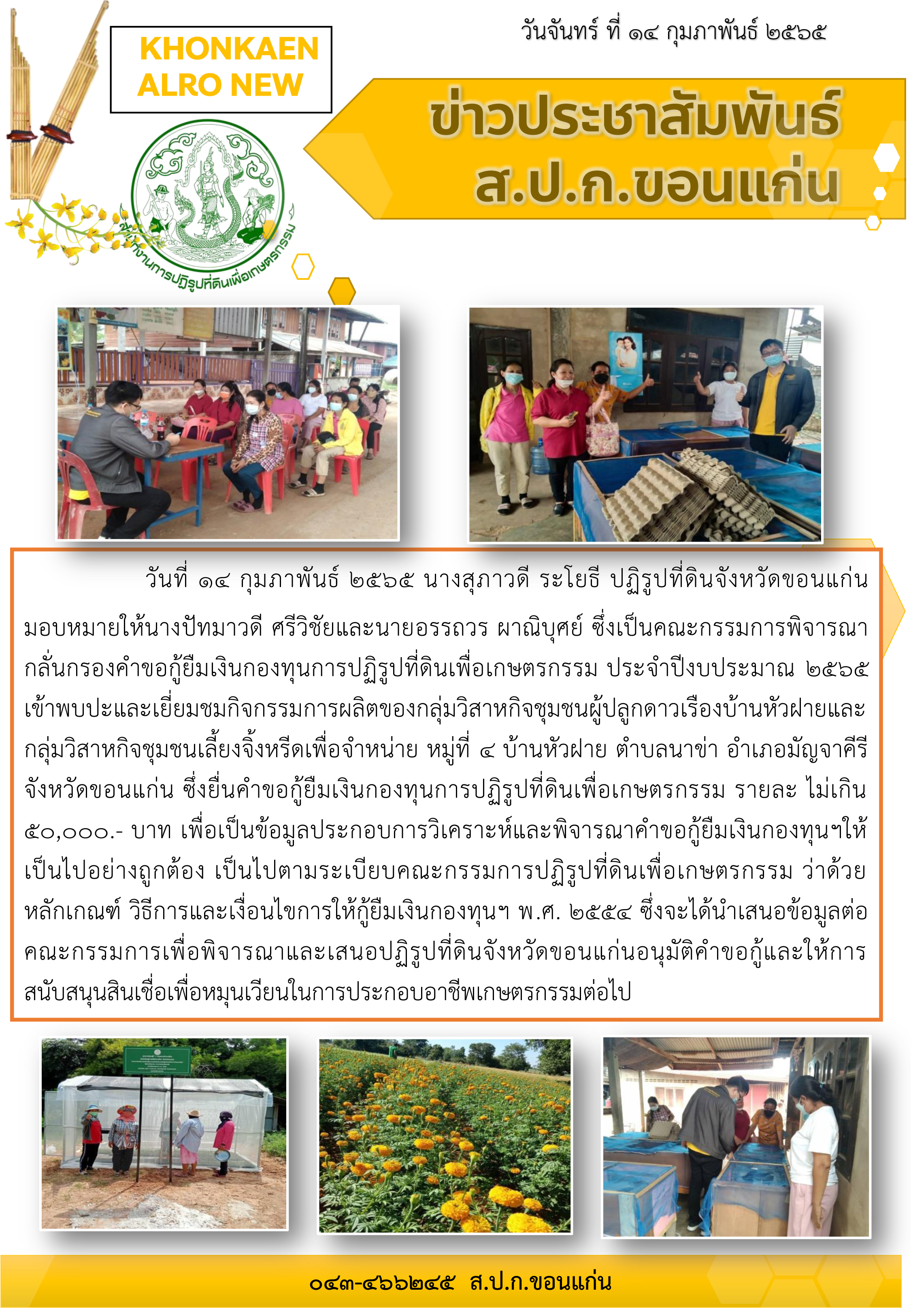 ส.ป.ก.ขอนแก่นอนุมัติสินเชื่อเงินกองทุนการปฏิรูปที่ดินเพื่อเกษตรกรรมแก่เกษตรกร 71 ราย รวมวงเงินทั้งสิ้น 3,550,000 บาท