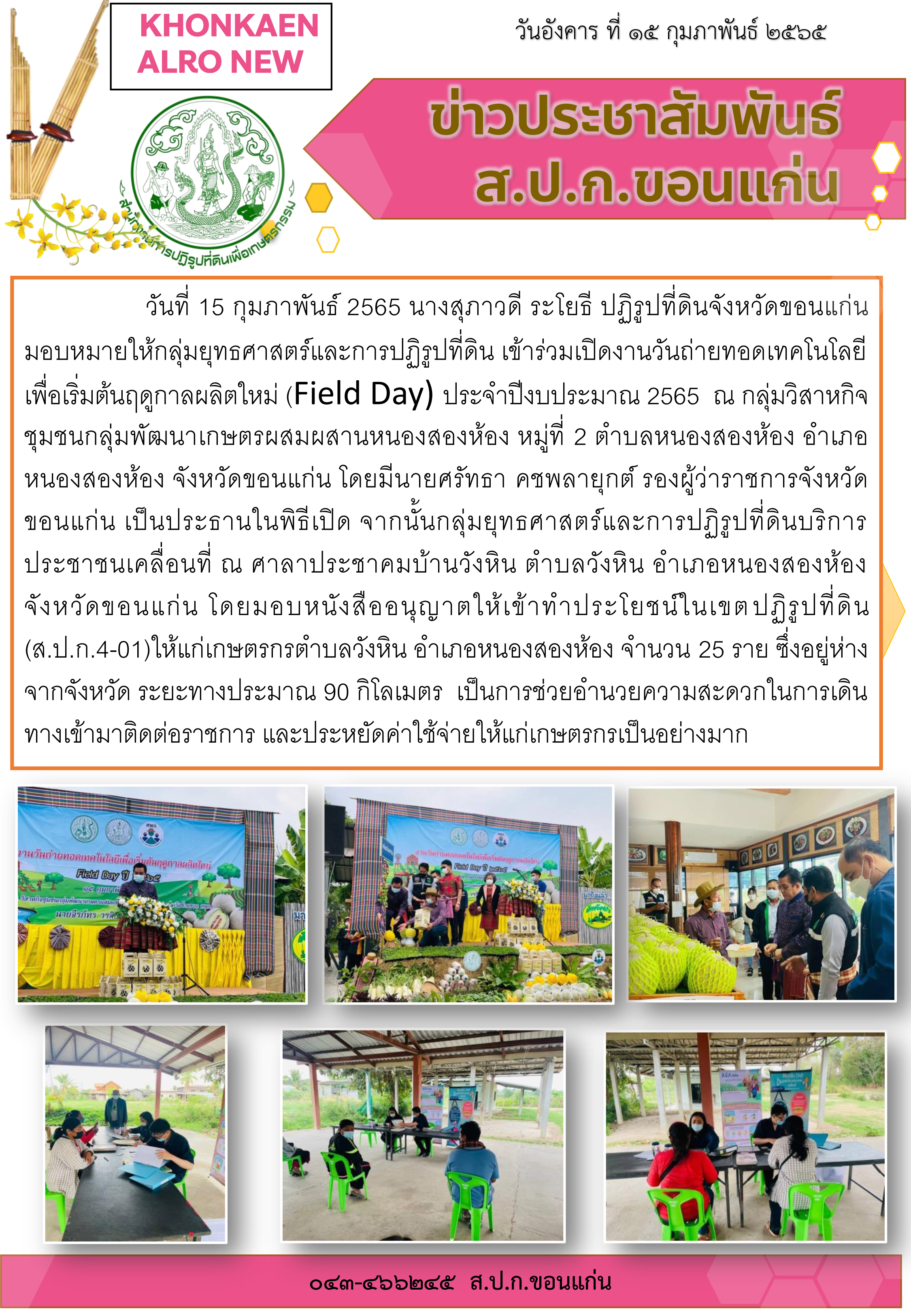 ส.ป.ก.ขอนแก่น เข้าร่วมเปิดงานวันถ่ายทอดเทคโนโลยีเพื่อเริ่มต้นฤดูกาลผลิตใหม่ (Field Day) ปี 2565 ณ ตำบลหนองสองห้อง อำเภอหนองสองห้อง จังหวัดขอนแก่น