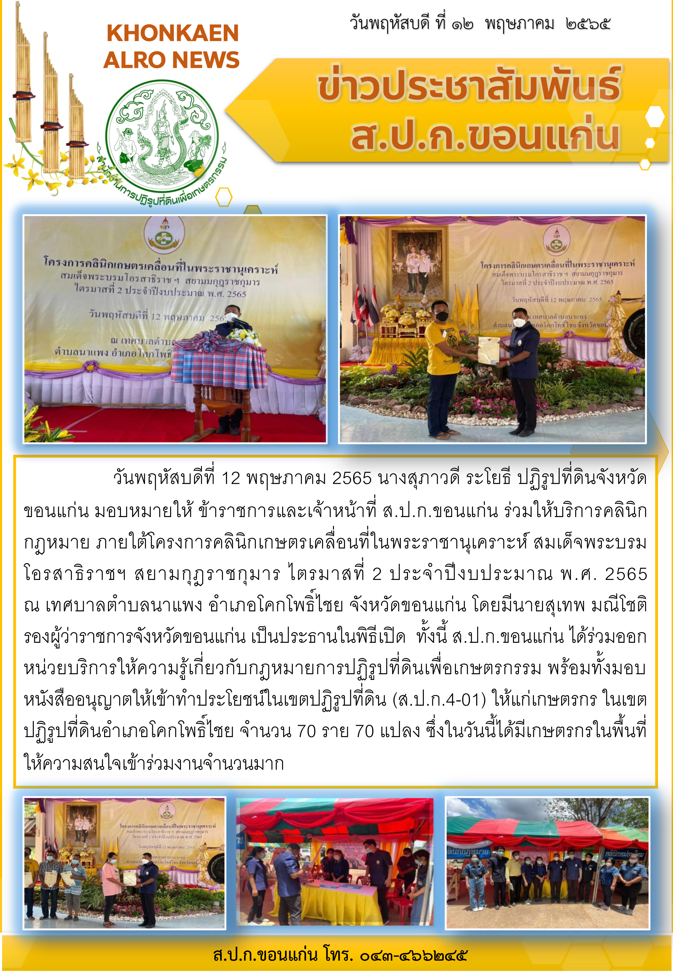 ส.ป.ก.ขอนแก่น เข้าร่วมให้บริการด้านคลินิกกฎหมาย ภายใต้โครงการคลินิกเกษตรเคลื่อนที่ฯ ไตรมาสที่ 2 ประจำปีงบประมาณ 2565 ณ เทศบาลตำบลนาแพง อำเภอโคกโพธิ์ไชย จังหวัดขอนแก่น
