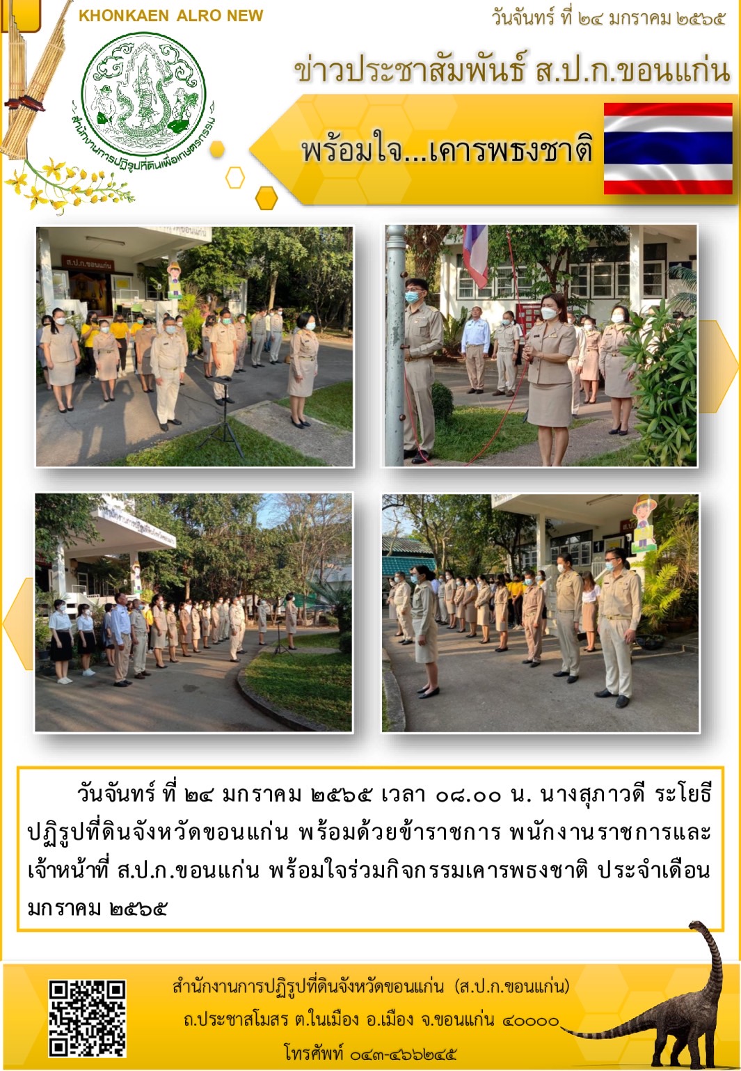 ส.ป.ก.ขอนแก่น ทำกิจกรรมเคารพธงชาติ ณ ลานเสาธง หน้าอาคาร 1 สำนักงานการปฏิรูปที่ดินจังหวัดขอนแก่น ประจำเดือนมกราคม ปี 2565