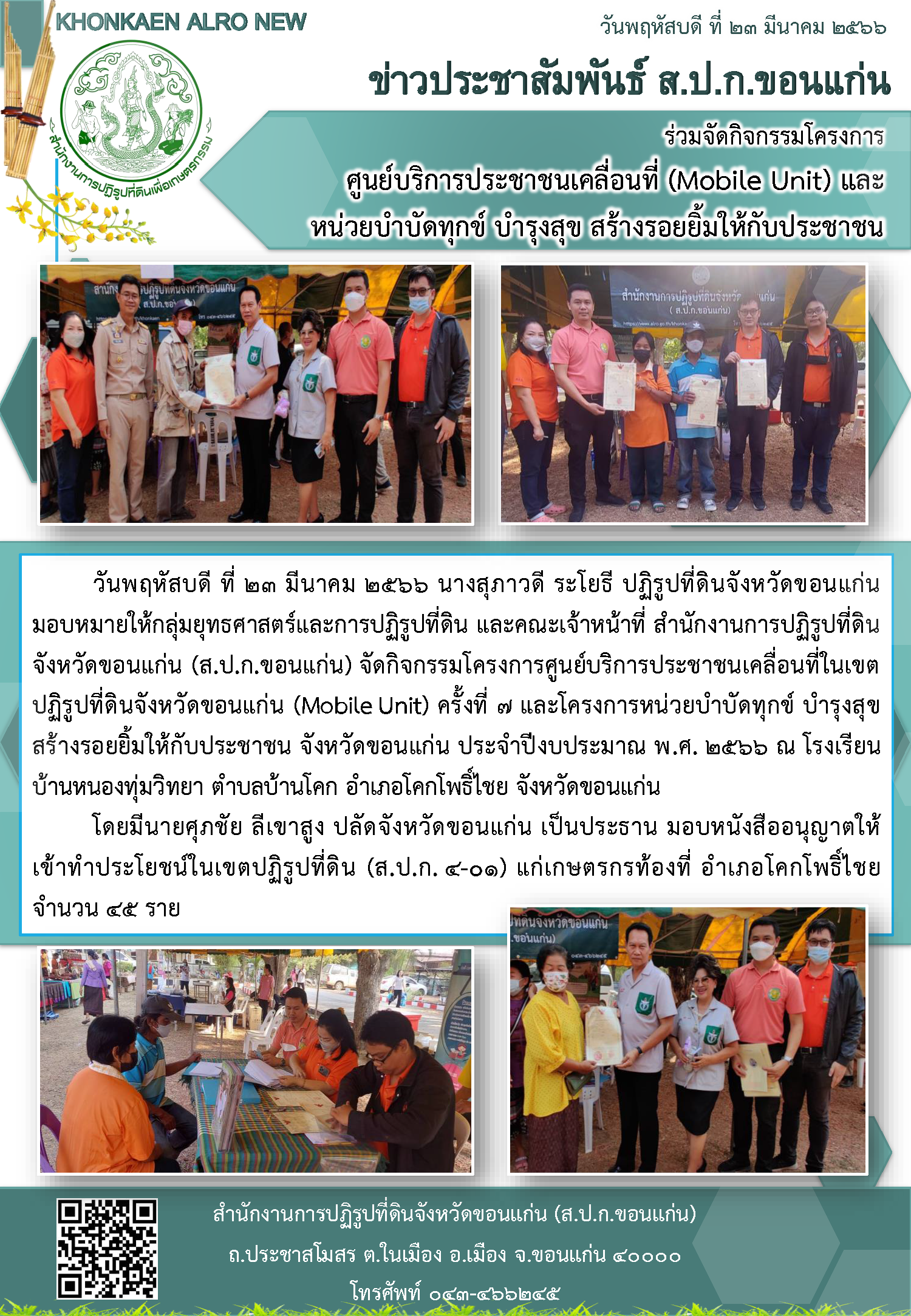 ส.ป.ก.ขอนแก่น จัดกิจกรรมโครงการ "ศูนย์บริการประชาชนเคลื่อนที่ในเขตปฏิรูปที่ดินฯ" และ "หน่วยบำบัดทุกข์บำรุงสุขฯ สร้างรอยยิ้มให้กับประชาชน"