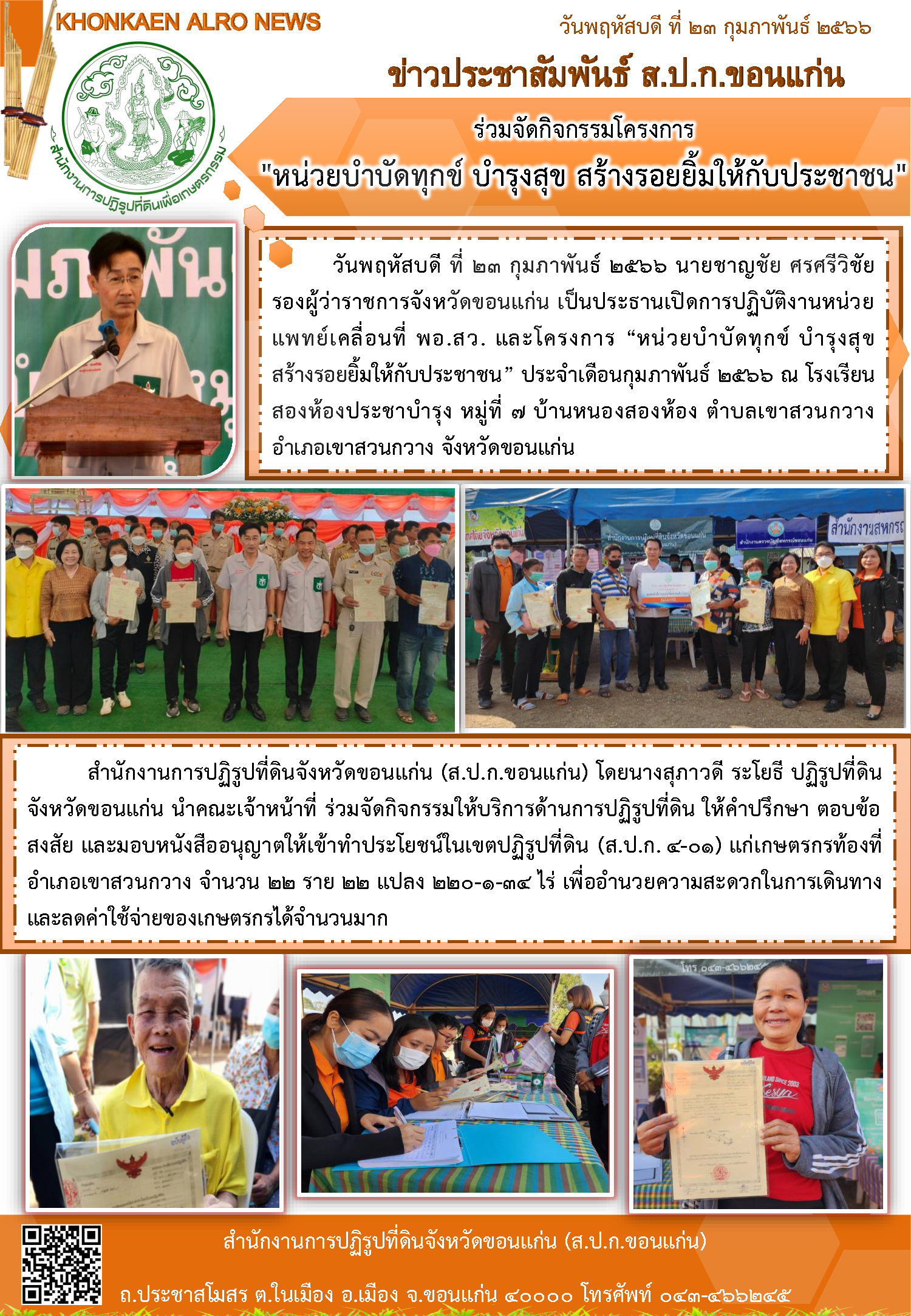ส.ป.ก.ขอนแก่น ร่วมจัดกิจกรรมโครงการ "หน่วยบำบัดทุกข์ บำรุงสุข สร้างรอยยิ้มให้กับประชาชน" อำเภอเขาสวนกวาง