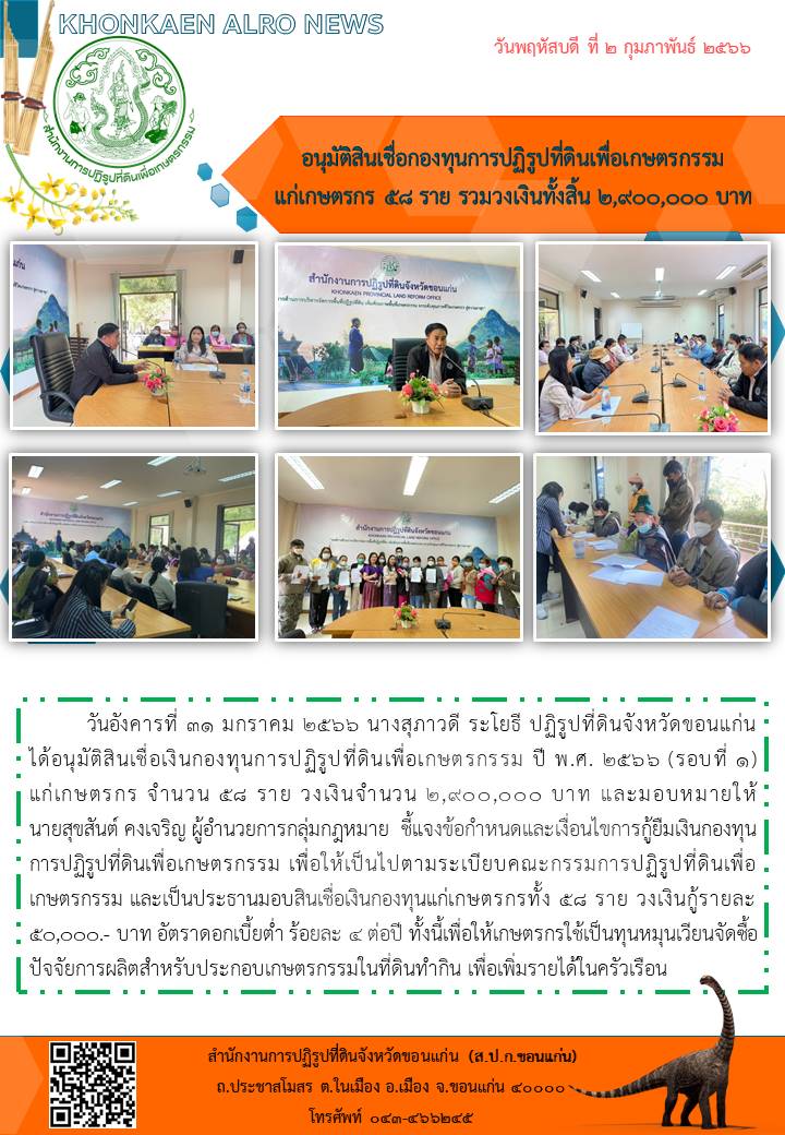ส.ป.ก.ขอนแก่น อนุมัติสินเชื่อเงินกองทุนการปฏิรูปที่ดินเพื่อเกษตรกรรม ครั้งที่ 1 ปี 2566