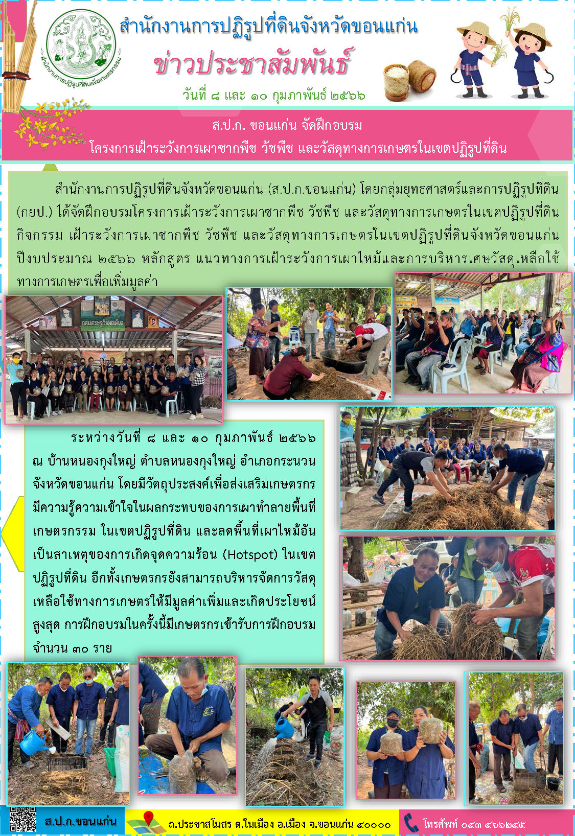 ส.ป.ก. ขอนแก่น จัดฝึกอบรมโครงการเฝ้าระวังการเผาซากพืช วัชพืช และวัสดุทางการเกษตรในเขตปฏิรูปที่ดิน