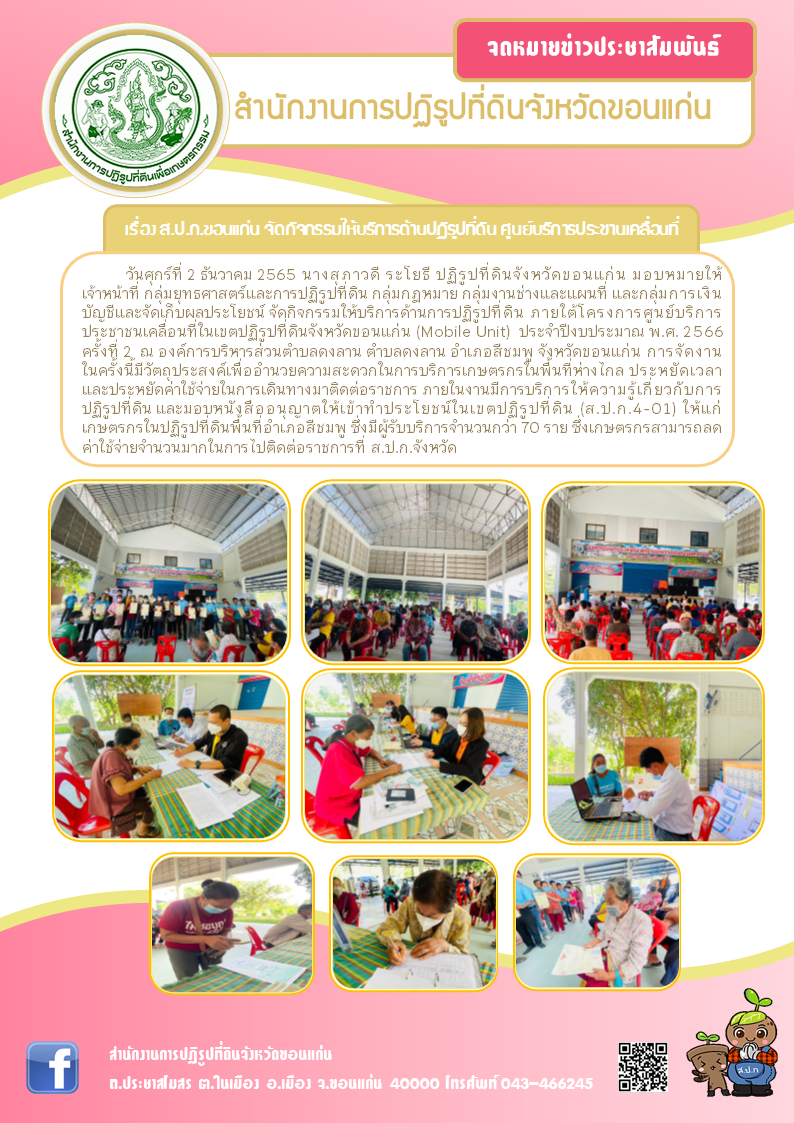 ส.ป.ก.ขอนแก่น จัดกิจกรรมโครงการ "ศูนย์บริการประชาชนเคลื่อนที่ในเขตปฏิรูปที่ดินฯ"