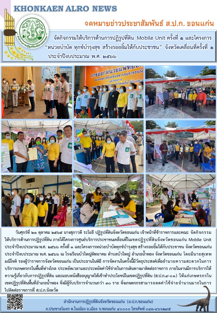 ส.ป.ก.ขอนแก่น ร่วมจัดกิจกรรมโครงการ "ศูนย์บริการประชาชนเคลื่อนที่ในเขตปฏิรูปที่ดินฯ" และ "หน่วยบำบัดทุกข์บำรุงสุขฯ สร้างรอยยิ้มให้กับประชาชน"