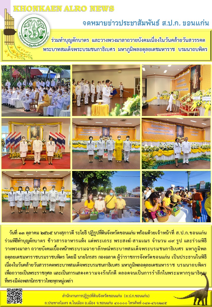 ส.ป.ก.ขอนแก่น ร่วมพิธีทำบุญตักบาตร และพิธีถวายบังคม เนื่องในวันคล้ายสวรรคตพระบาทสมเด็จพระบรมชนกาธิเบศร มหาภูมิพลอดุลยเดชมหาราชฯ