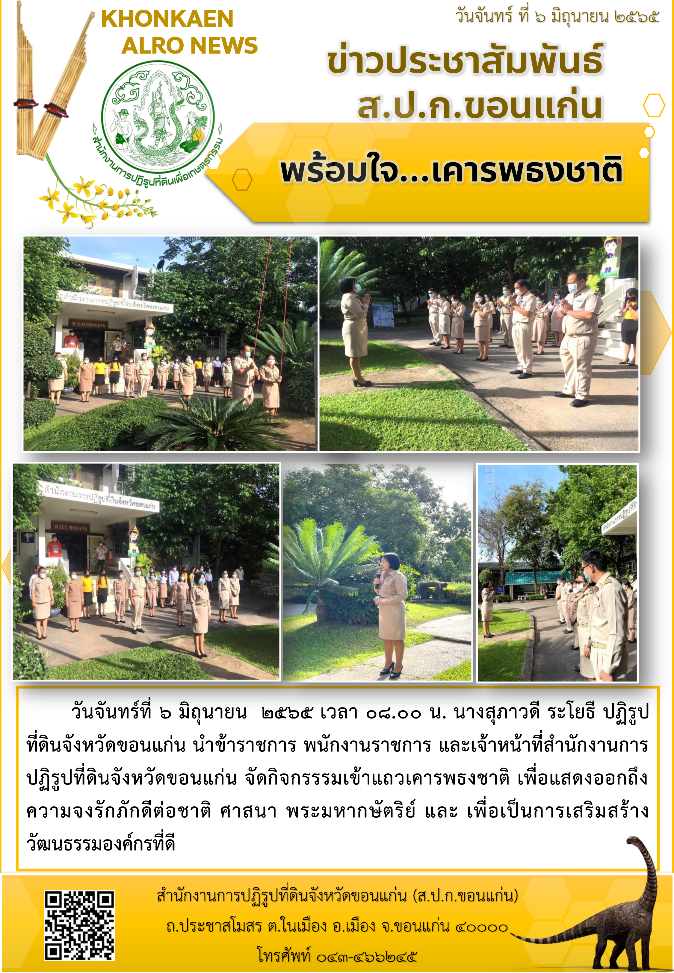 ส.ป.ก.ขอนแก่น ทำกิจกรรมเคารพธงชาติ ณ ลานเสาธง หน้าอาคาร 1 สำนักงานการปฏิรูปที่ดินจังหวัดขอนแก่น ประจำเดือนมิถุนายน ปี 2565