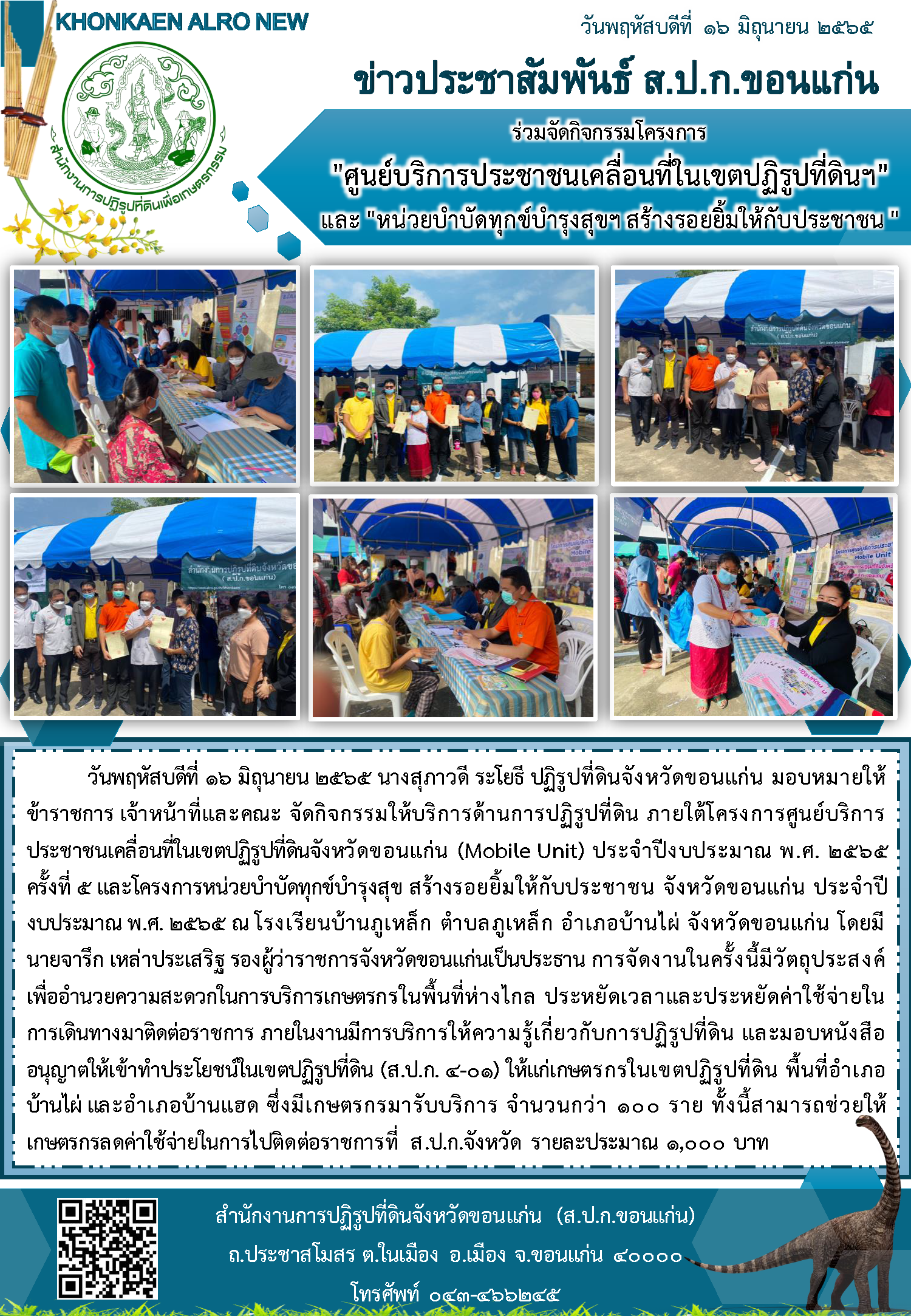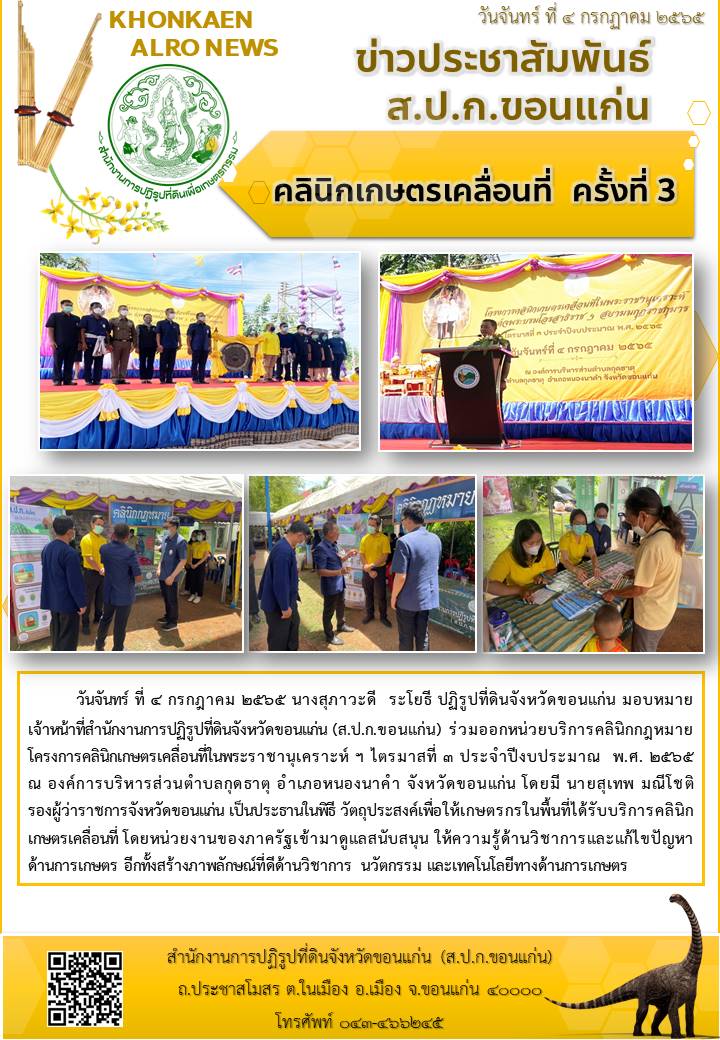 ส.ป.ก.ขอนแก่น ร่วมจัดกิจกรรมโครงการ "ศูนย์บริการประชาชนเคลื่อนที่ในเขตปฏิรูปที่ดินฯ" และ "หน่วยบำบัดทุกข์บำรุงสุขฯ สร้างรอยยิ้มให้กับประชาชน "
